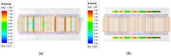 The magnetic flux density in the rotor back yoke and stator teeth, illustrated in Figure 5, remained below 1.6 T, indicating that magnetic saturation does not occur in these regions. These results confirm that the designed structure achieves an optimal magnetic flux distribution while effectively preventing excessive magnetic saturation.