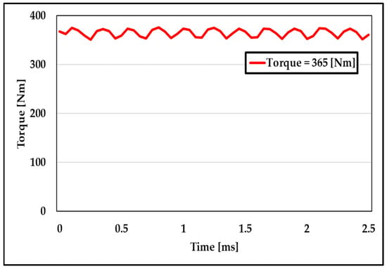 When sinusoidal currents are applied to each of the three-phase windings of the AFPM motor, the motor speed and phase currents remain stable, and the torque output satisfies the design specifications. As shown in Figure 6, the motor achieves a peak torque of 365 Nm at a speed of 4500 rpm, demonstrating stable operation under load conditions.
