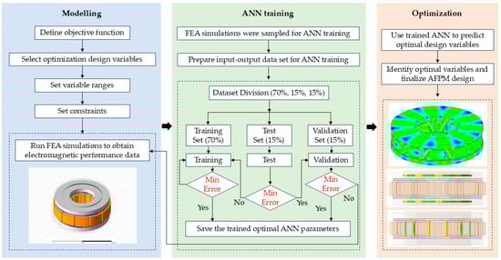 In the design process of an electric machine, it is not enough to simply present the theoretical validity; the actual implementability and design efficiency must be considered together. An axial magnetic flux type permanent magnet motor was designed using the ANSYS Maxwell 2025 R2 and various variable ranges were set to review the optimized performance. Based on the data obtained from this, an artificial neural network (ANN) model was constructed. ANN is a nonlinear approximation model that mimics the structure of a human neural network and consists of an input layer, a hidden layer, and an output layer. Each node performs a nonlinear transformation through a weight and an activation function and learns complex relationships between data. ANN is trained to predict output variables based on input variables and repeatedly optimizes input–output relationships through supervised learning. In the learning process, the weights are adjusted to minimize loss, and thus ANN may be precisely modeled [8,9]. After training, the ANN can provide fast and reliable predictions, which significantly reduces the computational burden of repeated 3D-FEA evaluations and allows efficient exploration of candidate designs [10].