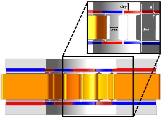 The main design parameters affecting the iron loss are airgap (g), depth of the rotor yoke (dry), width of the stator slot (wss), and depth of the stator slot (dss). The geometric locations of these variables within the AFPM motor are illustrated in Figure 9. Since iron loss is highly dependent on magnetic flux density, structural variations directly affect the flux distribution. Therefore, the parameter ranges were determined so that the flux density in the stator teeth and rotor back yoke remain within 1.2–1.6 T, avoiding magnetic saturation, and the selected ranges of these variables are summarized in Table 2.