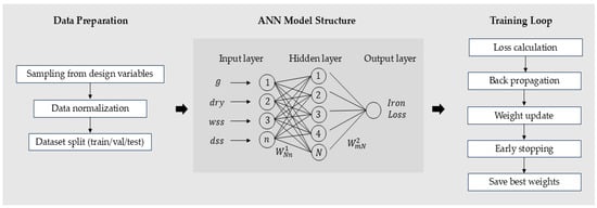A neural network-based surrogate model was employed to replace repetitive 3D-FEA evaluations during the optimization process, as illustrated in Figure 10. Unlike analytical iron loss formulations, the ANN directly learns the nonlinear relationship between the geometric parameters and the resulting iron loss using the dataset generated from 3D-FEA.