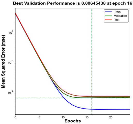 The neural network achieved the best validation performance at 16 epochs. Figure 11 shows the mean square error (MSE) distribution for the training, testing, and validation datasets, indicating similar loss trends among the datasets and confirming that overfitting did not occur. Figure 12 presents the regression relationship between the target and predicted values, where the regression line slope is close to 1, and the correlation coefficient (R2) is high, demonstrating that the ANN model achieved high reliability in predicting iron loss.