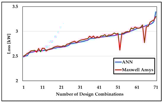 The trained ANN surrogate was then applied to all design combinations to predict iron loss. As shown in Figure 13, the ANN tracks the 3D-FEA trend across the entire set, with only two FEA dropouts appearing as outliers, while the ANN provides a smooth estimate. This confirms that the network generalizes well to different design values and is suitable for use in design optimization. The predicted iron loss values were ranked in ascending order, and the top-ranked combination was selected for the final optimized design, as listed in Table 3.