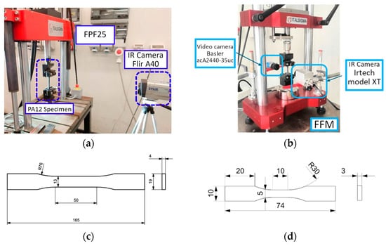 Due to machines’ different dimensions, two geometries of specimens, both realized in polyammide-12 (PA12) manufactured by HP MultiJet Fusion Process [20] have been used to verify the independence of results on load waveform. The ASTM D638 type I specimens were used to evaluate performance on FPF25 (Figure 1a), while specimens designed according to Avanzini et al. [21] were used to test FFM’s performance (Figure 1b). In fact, producing smaller test specimens, especially when testing materials obtained through additive manufacturing, represents an advantage for companies. Specimens’ geometries are reported in Figure 1c,d, in which units are expressed in millimeters. Both specimens’ sets were manufactured in XY direction, which was demonstrated to be the one characterized by better fatigue behavior [22].