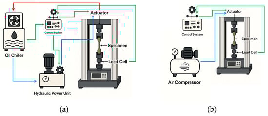 Using oil as the working fluid requires a dedicated apparatus designed to reach and maintain the desired pressure, ensuring that its properties remain stable under operating conditions. For this reason, in addition to the servo-hydraulic actuator, a hydraulic power unit and a cooling system are also necessary, as it is shown in representative diagram in Figure 2a. In Figure 2b, the FFM’s system representative diagram consisting of the tensile machine mounting the pneumatic actuator, an air compressor and the control system, is shown. In both diagrams, the analog-digital connections and the information required by the control system (such as transducer measurements, oil temperature, and pressure settings) are represented by green arrows, which also represent the feedback signals used in the closed-loop calibration process. These signals are continuously transmitted to the control system, which compares them with reference values and adjusts the actuator command accordingly.