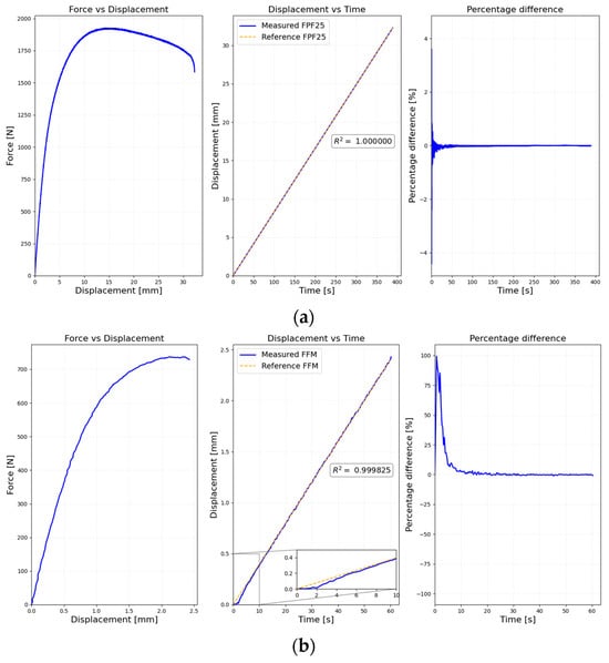 The performance of the actuators during the quasi-static tests was evaluated by calculating the percentage differences between the measured displacement and the reference ramp. In Figure 3a, it can be observed that FPF25 servo-hydraulic actuator’s crosshead displacement closely follows the reference ramp, as evidenced by the small percentage differences between the measured and reference displacements [33].