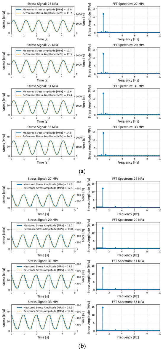 The analysis began with the evaluation of the cyclic stress waveforms corresponding to each load level, applied to both specimen types using the FPF25 and FFM testing machines, according to the procedures detailed in Section 2.