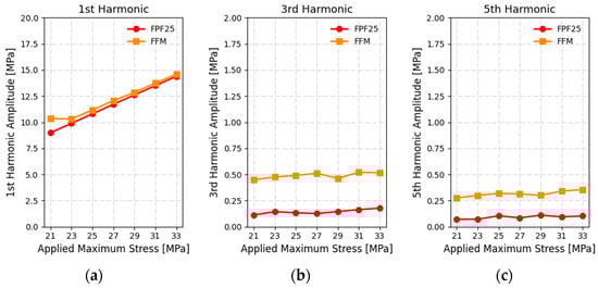 (a) First; (b) Third; (c) Fifth harmonic amplitude versus applied maximum stress for FPF25 and FFM.