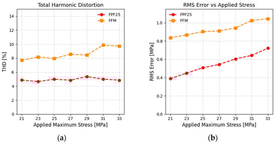 Focusing on the THD% (Figure 6a), which accounts for the entire harmonic content except for the fundamental harmonic, it can be observed that the FPF25 exhibits an average THD% of 4.94 ± 0.22% across all load steps, while the FFM shows a higher value of 8.63 ± 0.85%. This difference is attributed to the characteristics of the working fluid. It is also noteworthy that the THD% of the FFM increases consistently with the applied maximum stress. In the RMSE graph (Figure 6b), it can be observed how increases with applied stress in both cases, highlighting how RMSE alone cannot entirely represent the actuator’s performance, since it encloses both amplitude and phase differences between measured and reference signals. An RMSE of 0.551 ± 0.115 MPa was obtained for FPF25, and 0.932 ± 0.078 MPa for FFM.