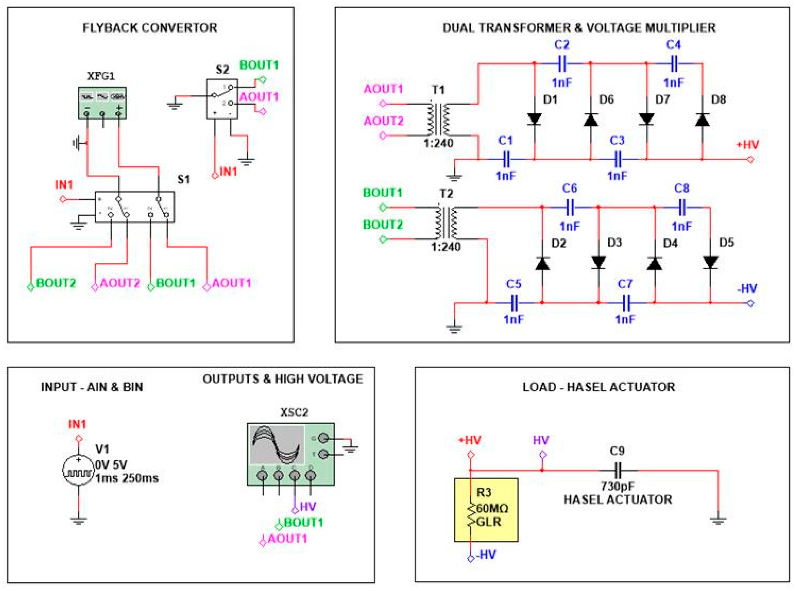 - Tynan, L.; Gunawardana, U.; Liyanapathirana, R.; Perera, O.; Esposito, D.; Centracchio, J.; Gargiulo, G. Low-Cost High-Voltage Power Supply for Hydraulically Amplified Self-Healing Electrostatic Applications. Machines 2024, 12, 758. [Google Scholar] [CrossRef]