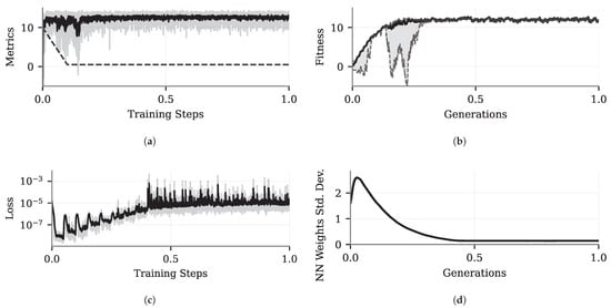 In another work, ref. [42] employed ES to train simple linear policies and compared their performance to standard machine learning training methods in the MuJoCo and Atari environments. The results demonstrated that ES policies often matched or surpassed the performance of more complex deep neural networks trained using techniques such as PPO and DQN, allowing simple training policies in situations where traditional algorithms can only learn using complex ones.