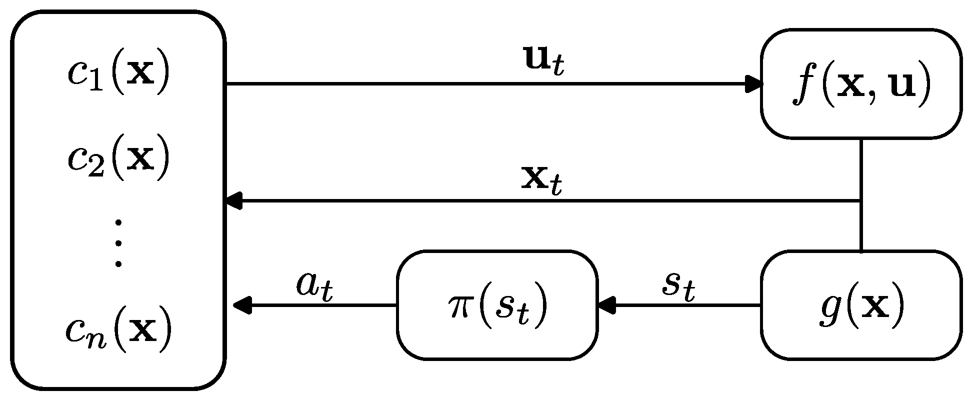 This paper uses the following notation: bold, capital letters () represent matrices, and bold lowercase letters () represent vectors. Italic letters denote time-variant scalars, while non-italic, roman letters () denote constants. denotes neural network weights or parameters. To remain consistent with the relevant literature, and represent the current and following system states, respectively.