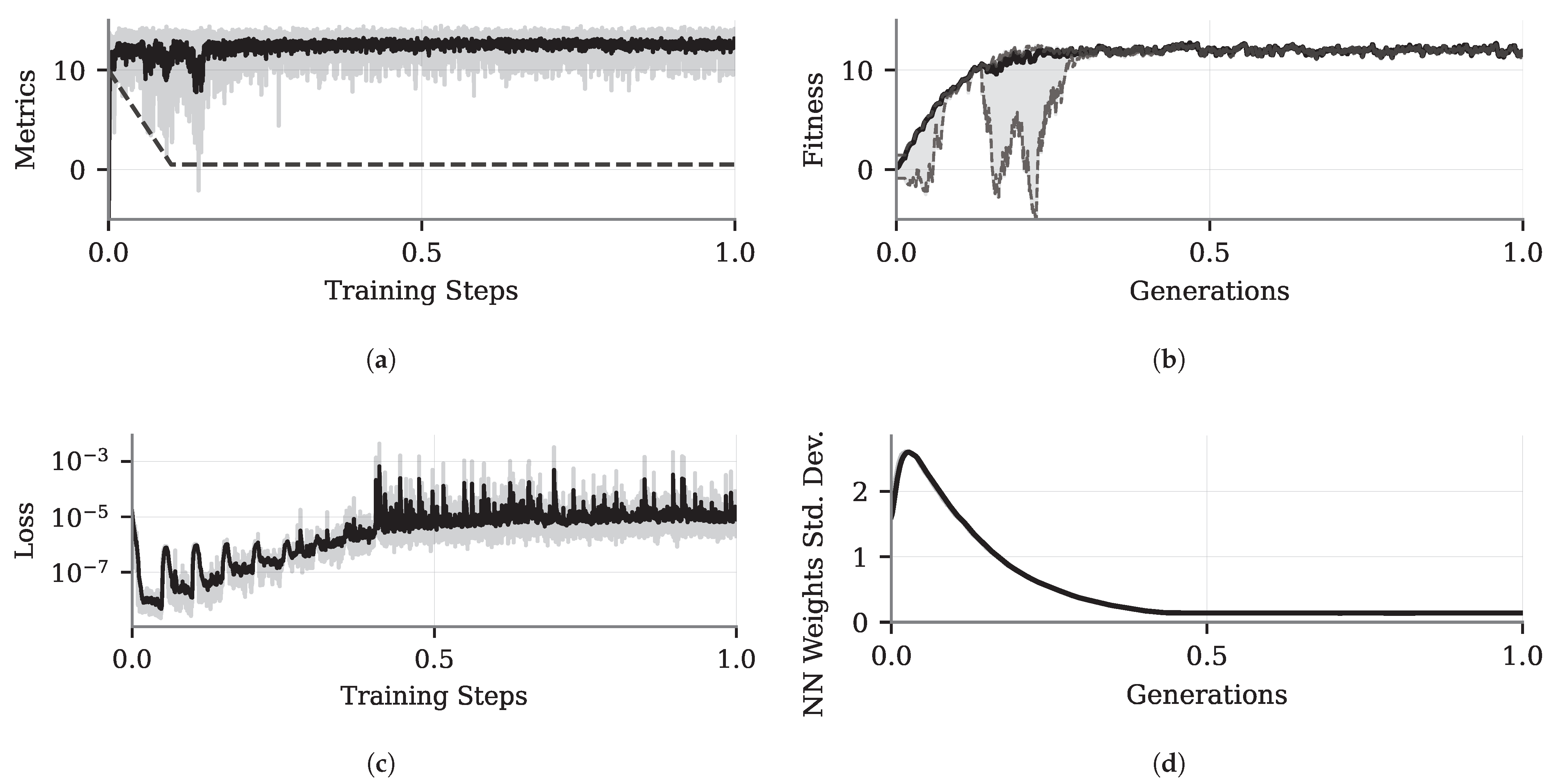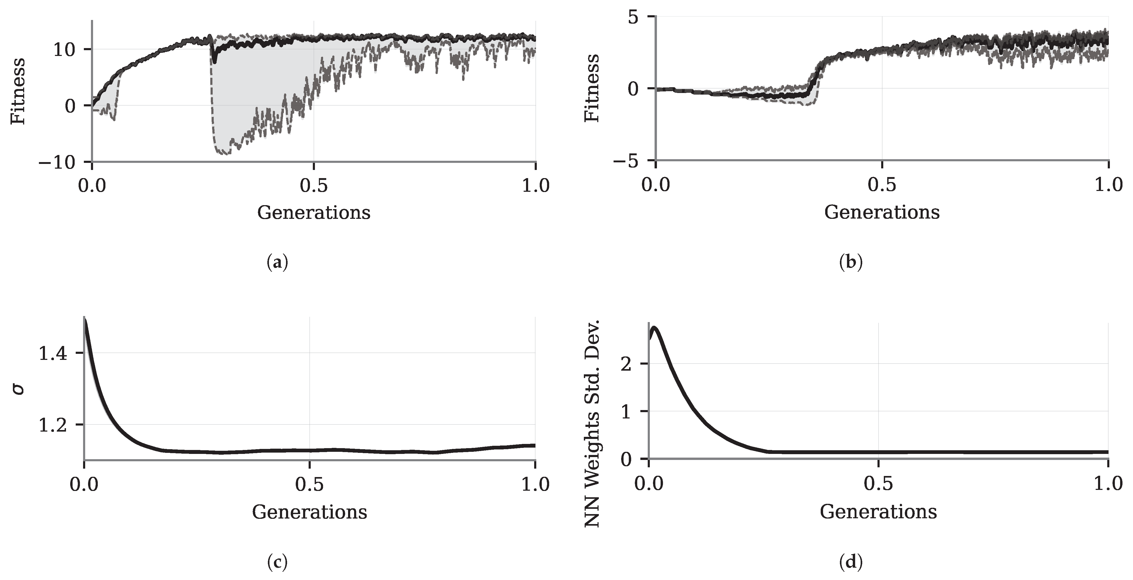Figure 5b illustrate that, despite using the curriculum approach, the fitness value in the first generation is close to zero and can even be negative, mainly because the neural network weights are initialized randomly, causing the policy to change controllers frequently and leading the system to instability. As the generations progress, the policies become more deterministic. This convergence reduces the variance among the NN weights (