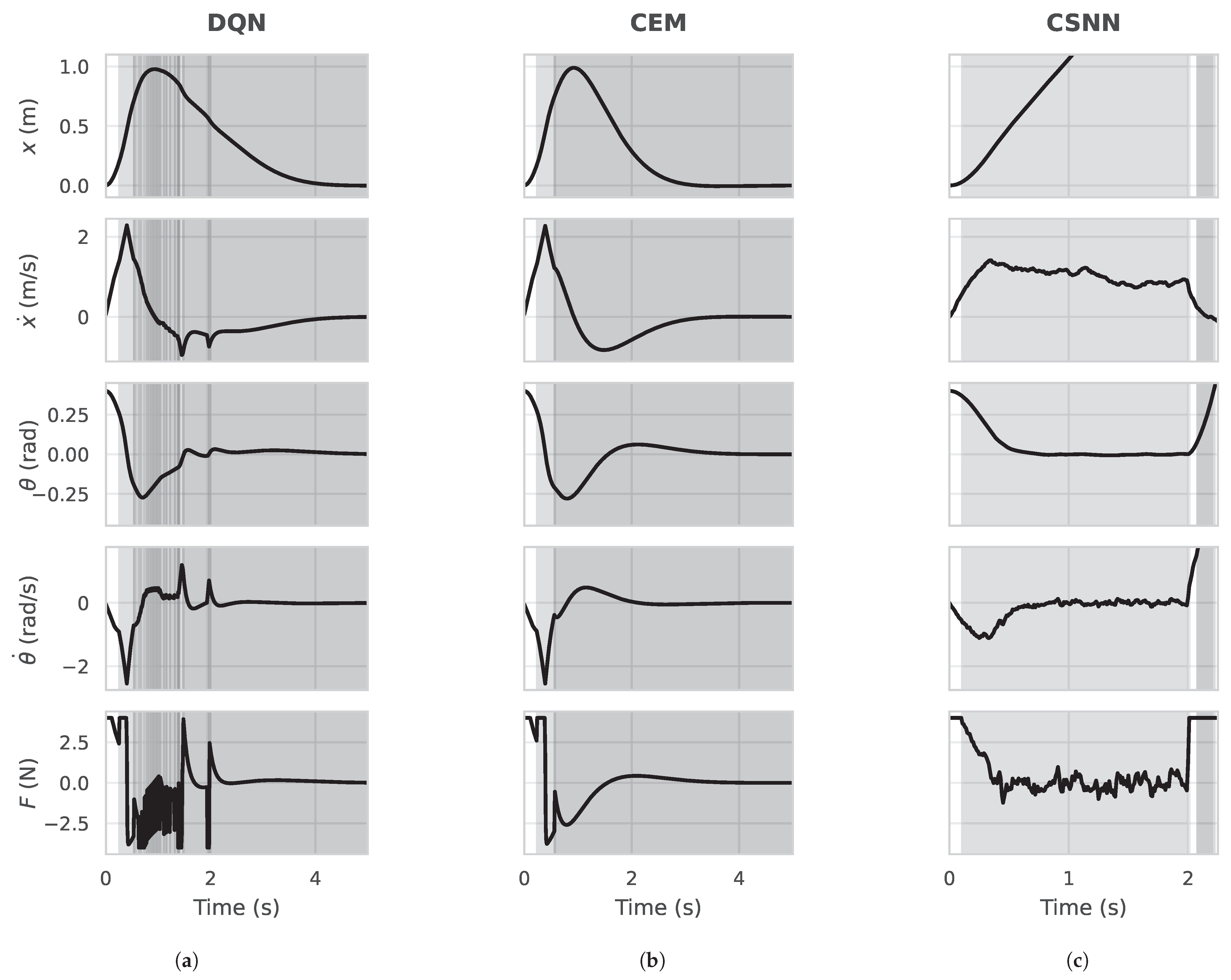 Figure 8 shows the cart-pendulum state behavior using the DQN, CEM, and CSNN approaches to select the controller. The initial state is