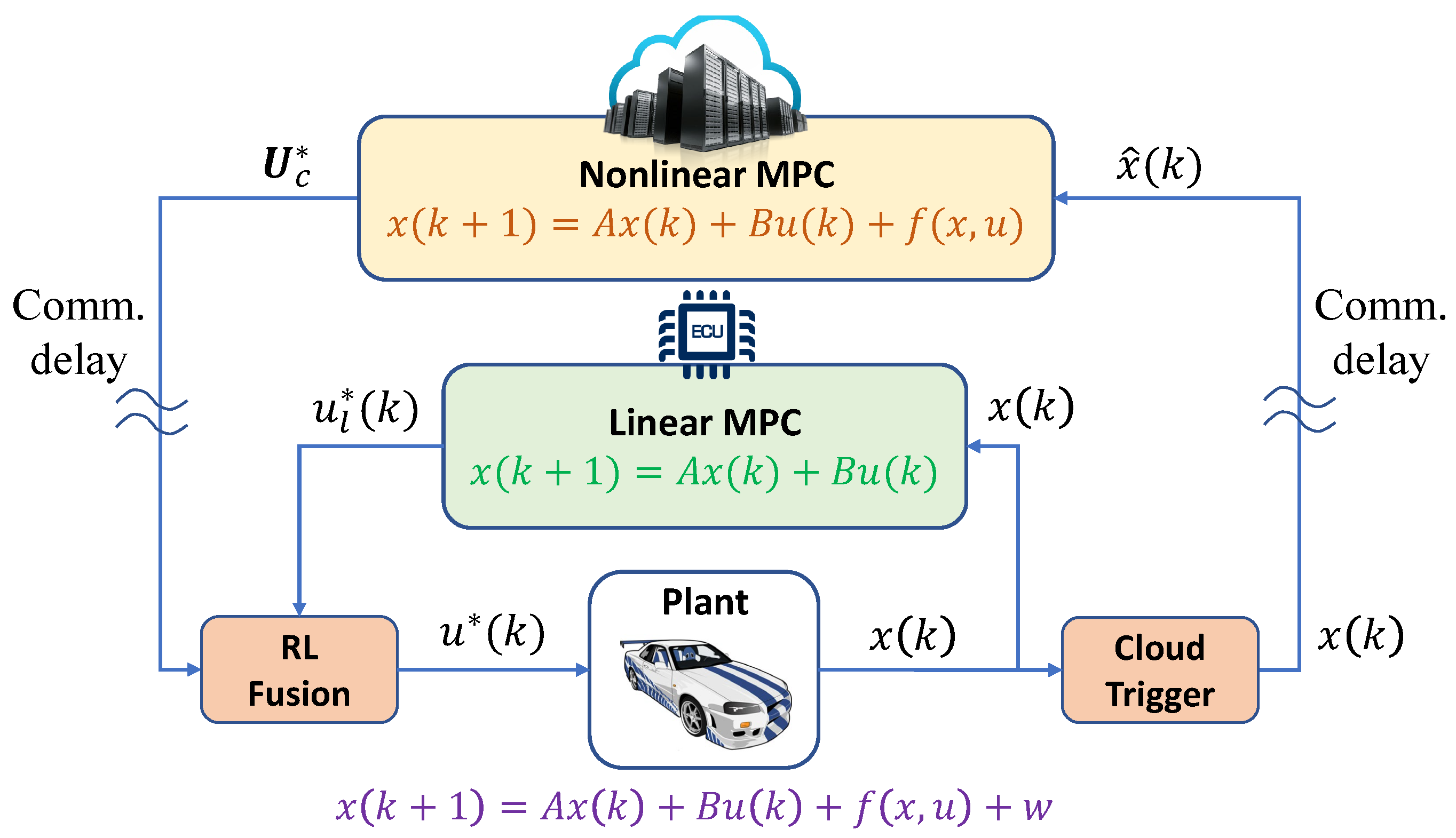 Figure 1. Illustration of the proposed cloud-assisted MPC framework embedded with DRL-based control fusion policy.