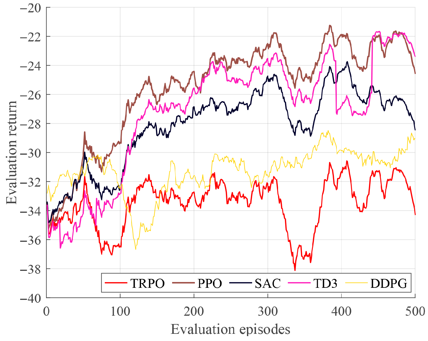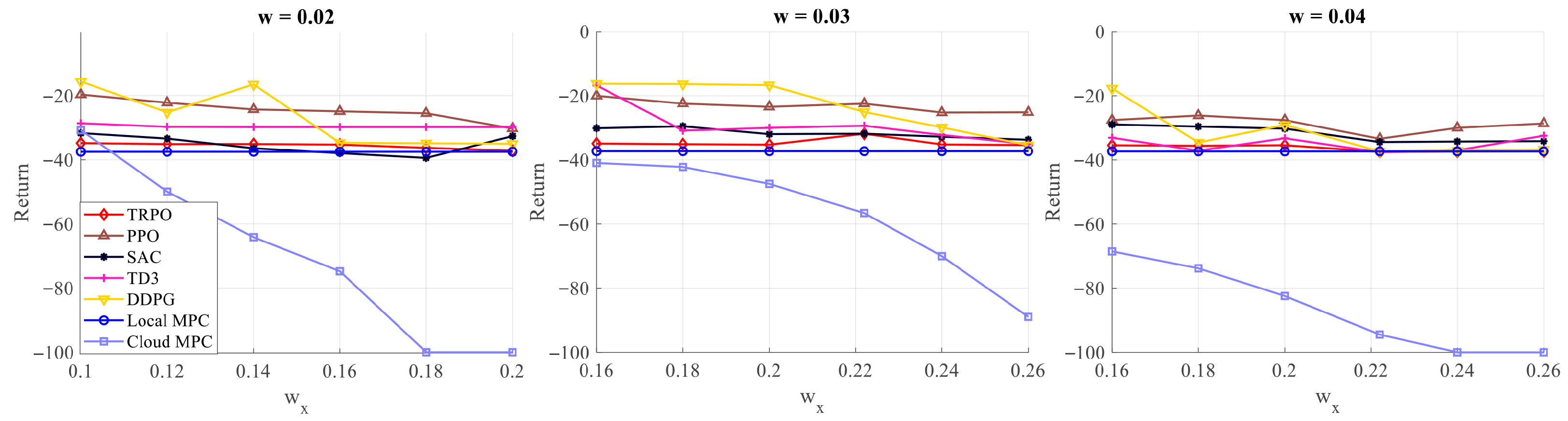 We first evaluate some classical RL algorithms to see which algorithm works best for the considered vehicle tracking problem, including TRPO [27], PPO [28], SAC [26], TD3 [25], and DDPG [24]. The evaluation curves of those RL algorithms under nominal disturbances ( w = 0.02 , w x = 0.1 ) are illusrated in Figure 2, which shows that TD3 and PPO are two best-performing models. We further evaluate the performance of different RL models under various disturbance levels. As shown in Figure 3, PPO stands out as the best model that consistently outperforms other models. It is worth noting that all RL models can work better than either local MPC or cloud MPC alone.