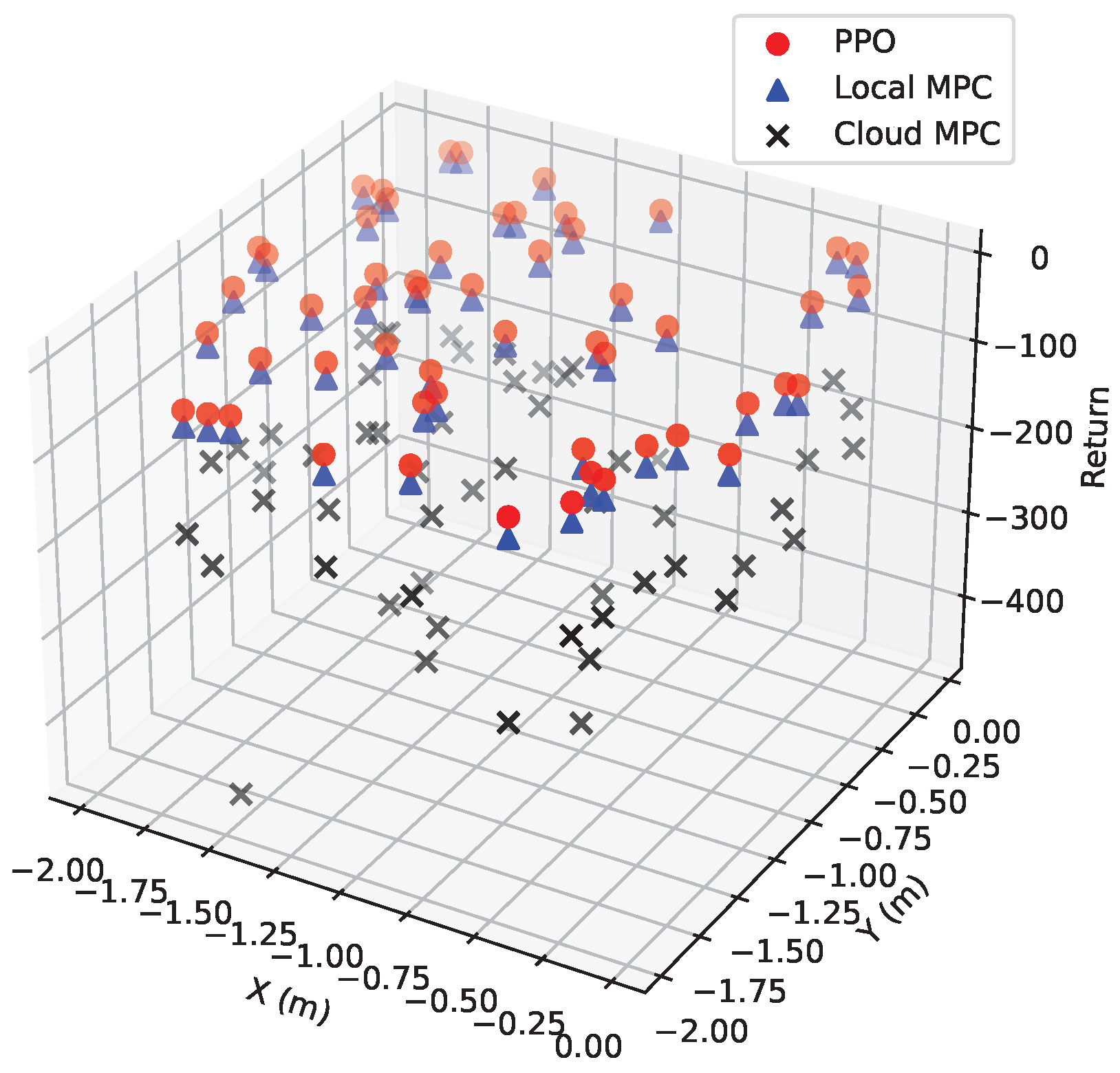Since PPO works best, it is chosen as the RL algorithm for further comparisons. A detailed comparison between PPO and local/cloud MPC under different initial conditions is shown in Figure 4. It can be seen that PPO consistently perform better for a wide range of initial conditions.