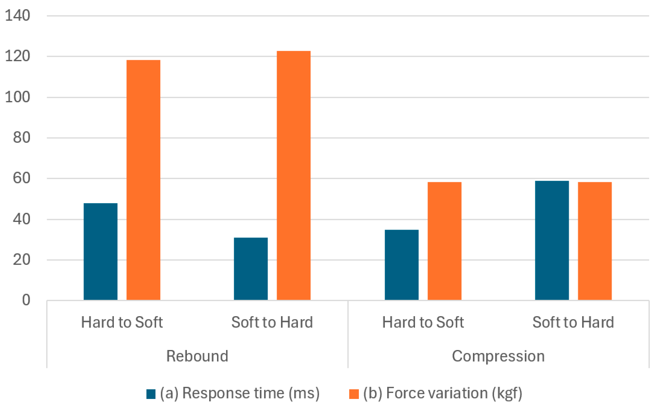 Furthermore, the soft-to-hard damping test mode, which builds up the damping force, exhibits slower responsiveness than the hard-to-soft damping test mode, which reduces the damping force. The responsiveness varied depending on the damper excitation conditions. However, it was measured to be around 60 ms at most, indicating that the system can control the 0.5 to 3 Hz range, which is a key frequency band for body and handling.