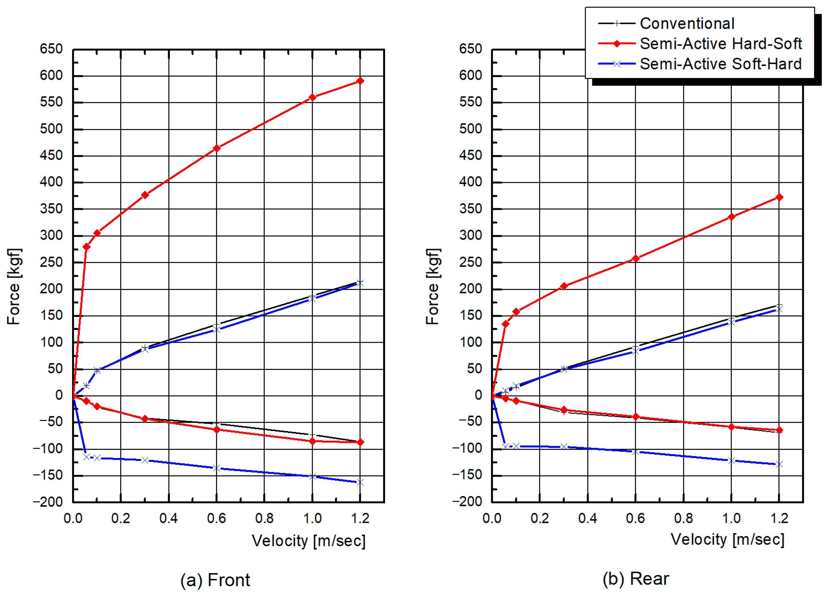 Figure 4 shows the damping force–speed characteristics of the semi-active ECS damper set for the front (a) and rear (b) wheels. These characteristics were checked based on the control current maps for each axle during the pre-test tuning phase. They were designed to balance driving stability and ride comfort by adjusting the damping force ratio in low- and high-speed ranges.