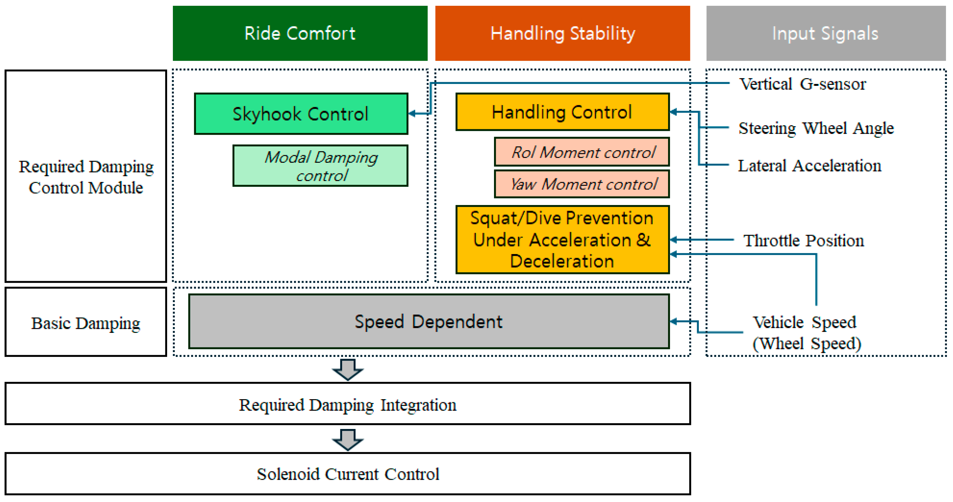 Furthermore, anti-dive/anti-squat compensation logic is additionally applied by detecting vehicle acceleration/deceleration states (throttle position, brake switch). The system is designed to respond to frequency-dependent road disturbances through a speed-based damping force compensation function during high-speed driving. This architecture is extended to enable signal exchange with the VDC system via the Controller Area Network (CAN), thereby enhancing yaw stabilization. Hereafter, the mathematical models and algorithms for each detailed controller—Skyhook-based ride control (