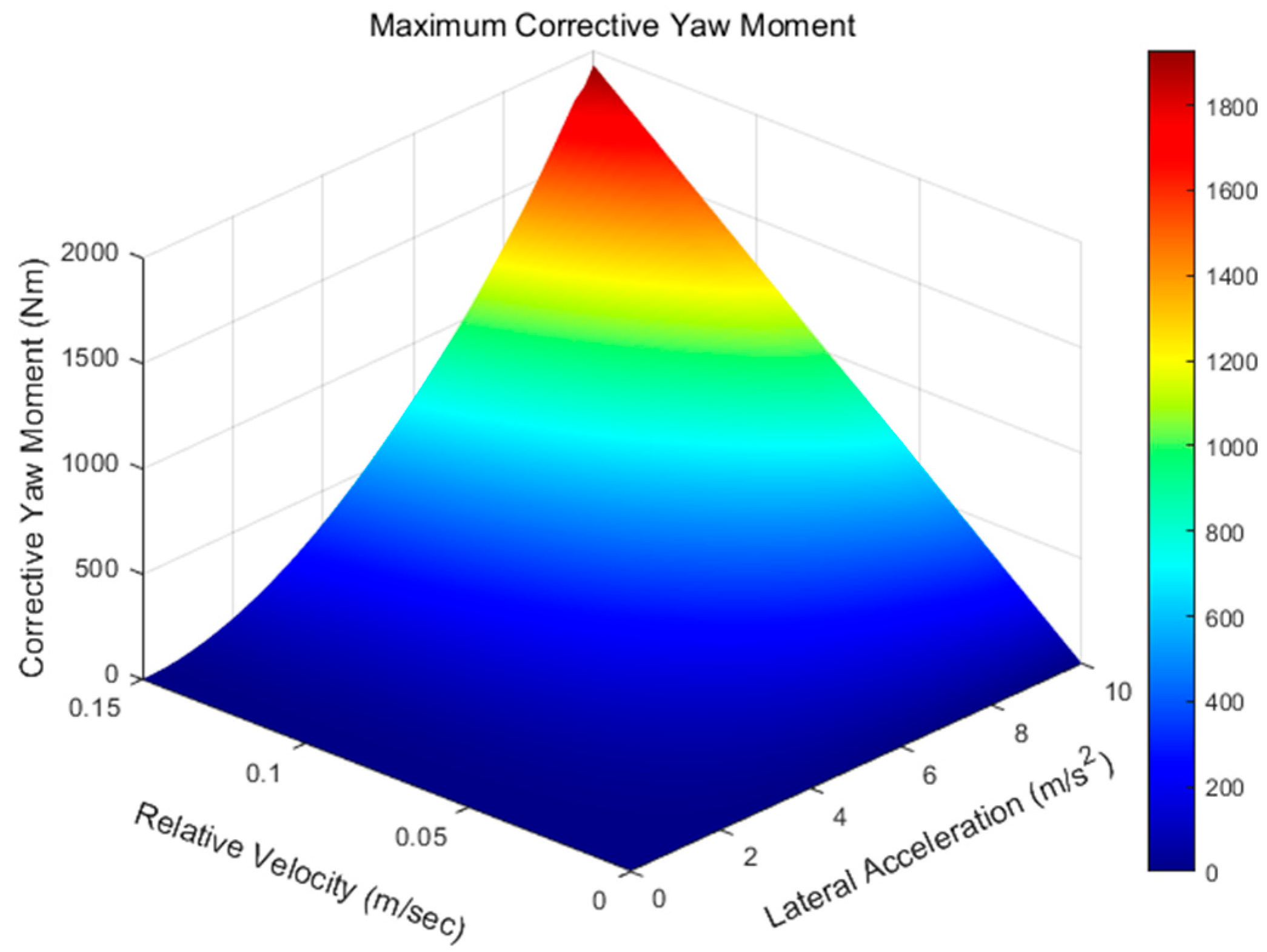 Figure 7 shows that the yaw compensation moment increases as the vehicle’s lateral acceleration and damper relative speed change. The amount of compensation depends on the change in tire vertical force caused by the damper speed change resulting from the vehicle’s roll rate behavior, the tire cornering stiffness, and the basic vehicle specifications, and can be defined as follows (Equation (21)). Here, P represents the basic vehicle specifications. It can be seen that if the vehicle design parameters, such as the damper and tire, are correctly set, the vehicle’s yaw compensation moment can be appropriately generated.