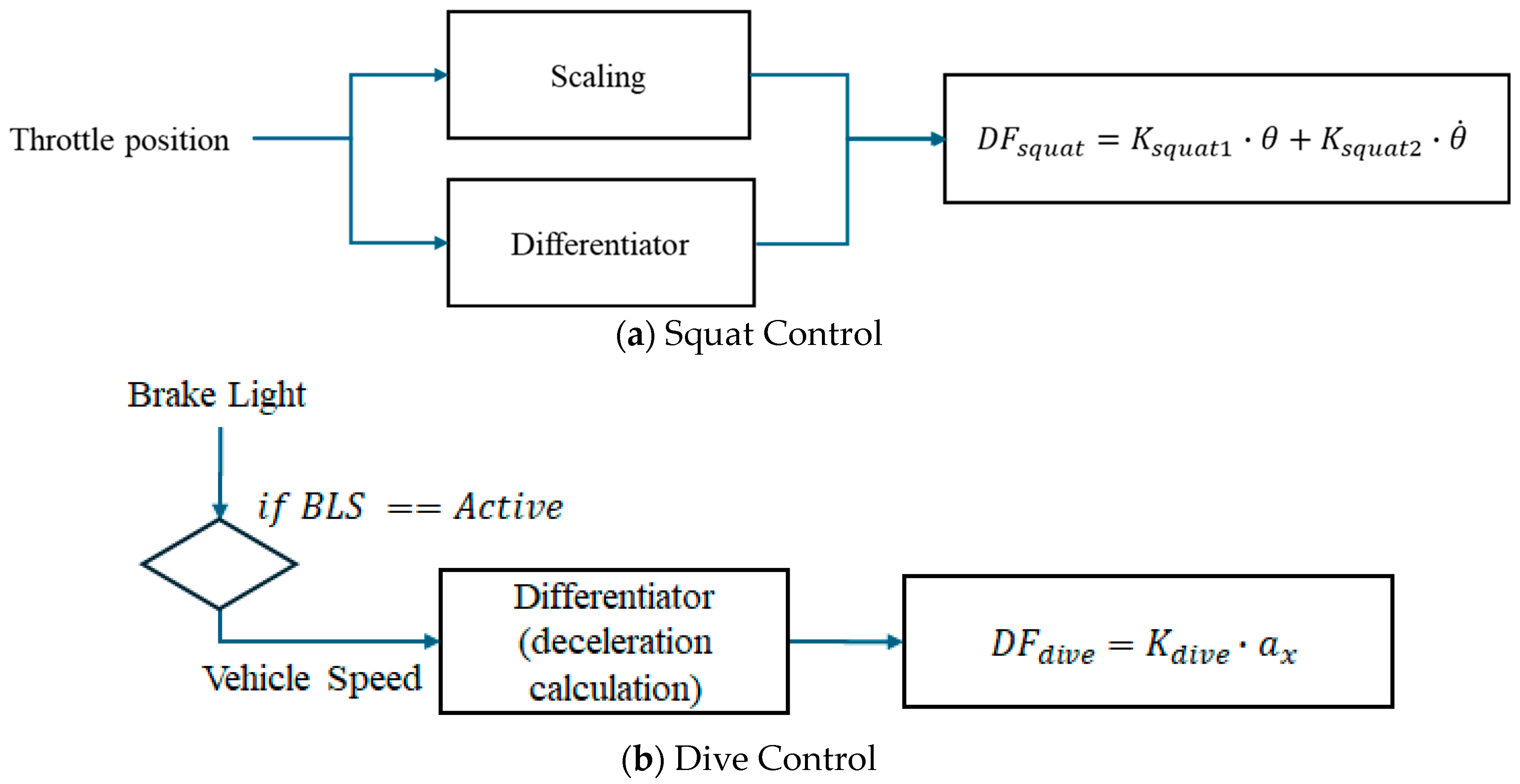 Figure 8b shows a control schematic for controlling the nose-down phenomenon that occurs when the vehicle brakes. The final deceleration is calculated based on the vehicle speed and used as a control decision factor.