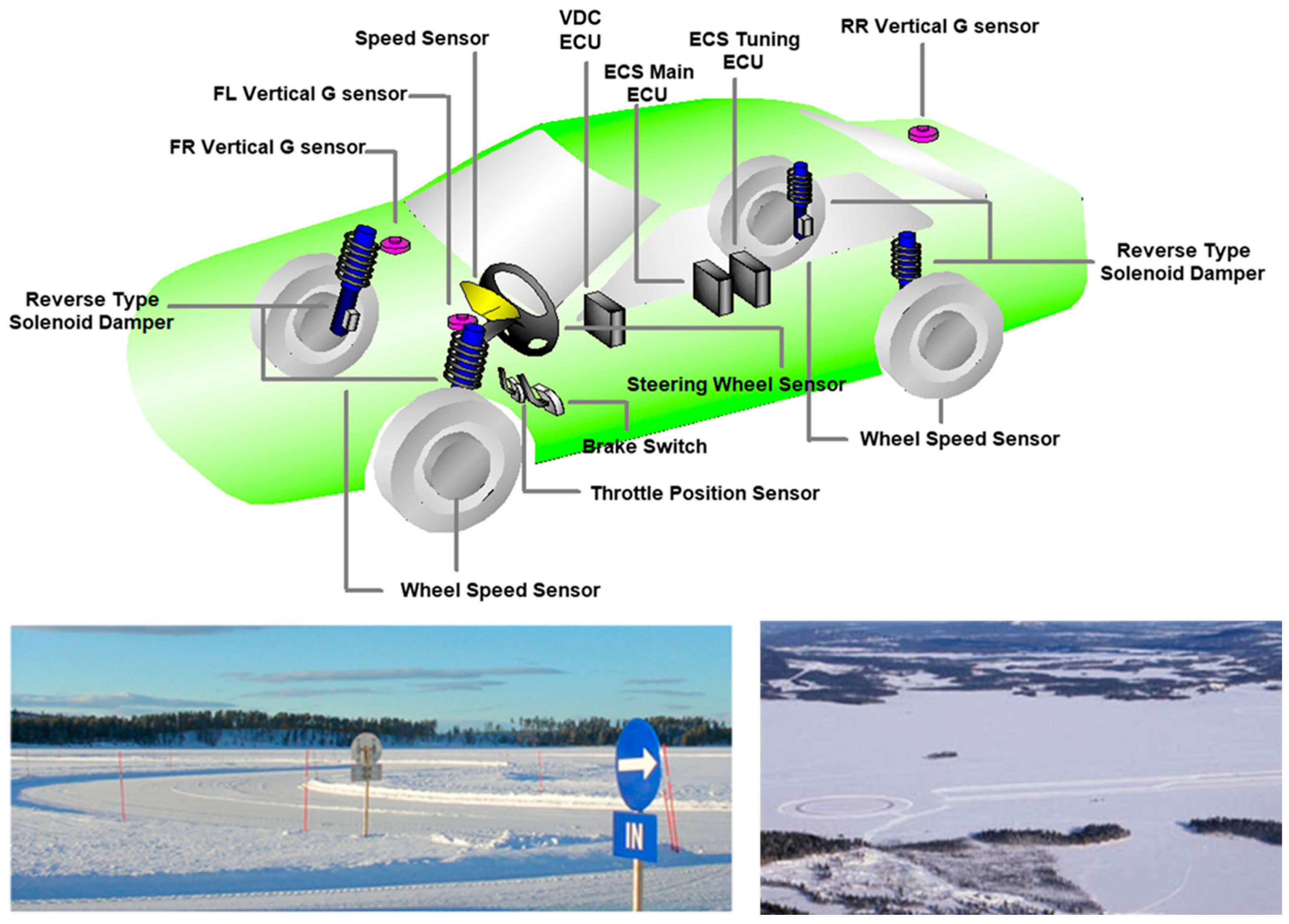 To verify the performance of a semi-active suspension on low-friction surfaces, a consistent road surface is required, ensuring a homogeneous coefficient of friction. To achieve this, a handling test was conducted on the Arjeplog Snow Road in Sweden. The test was conducted on a mid-size sedan, with the VDC system and the ECS (Electronically Controlled Suspension) system sharing internal signals via CAN (Controller Area Network) communication. The VDC system is an active safety system that stabilizes the vehicle’s attitude by assessing understeering/oversteering conditions in the vehicle’s yaw behavior. It typically incorporates the functions of an anti-lock braking system (ABS) and a traction control system (TCS). The VDC receives wheel speed signals, throttle position, and BLS information, and the ECS system is configured to output control outputs to the VDC system. This study focused on controlling stability and sensitivity while maintaining ride comfort on low-friction surfaces, with a focus on tuning the control system and measuring its performance.