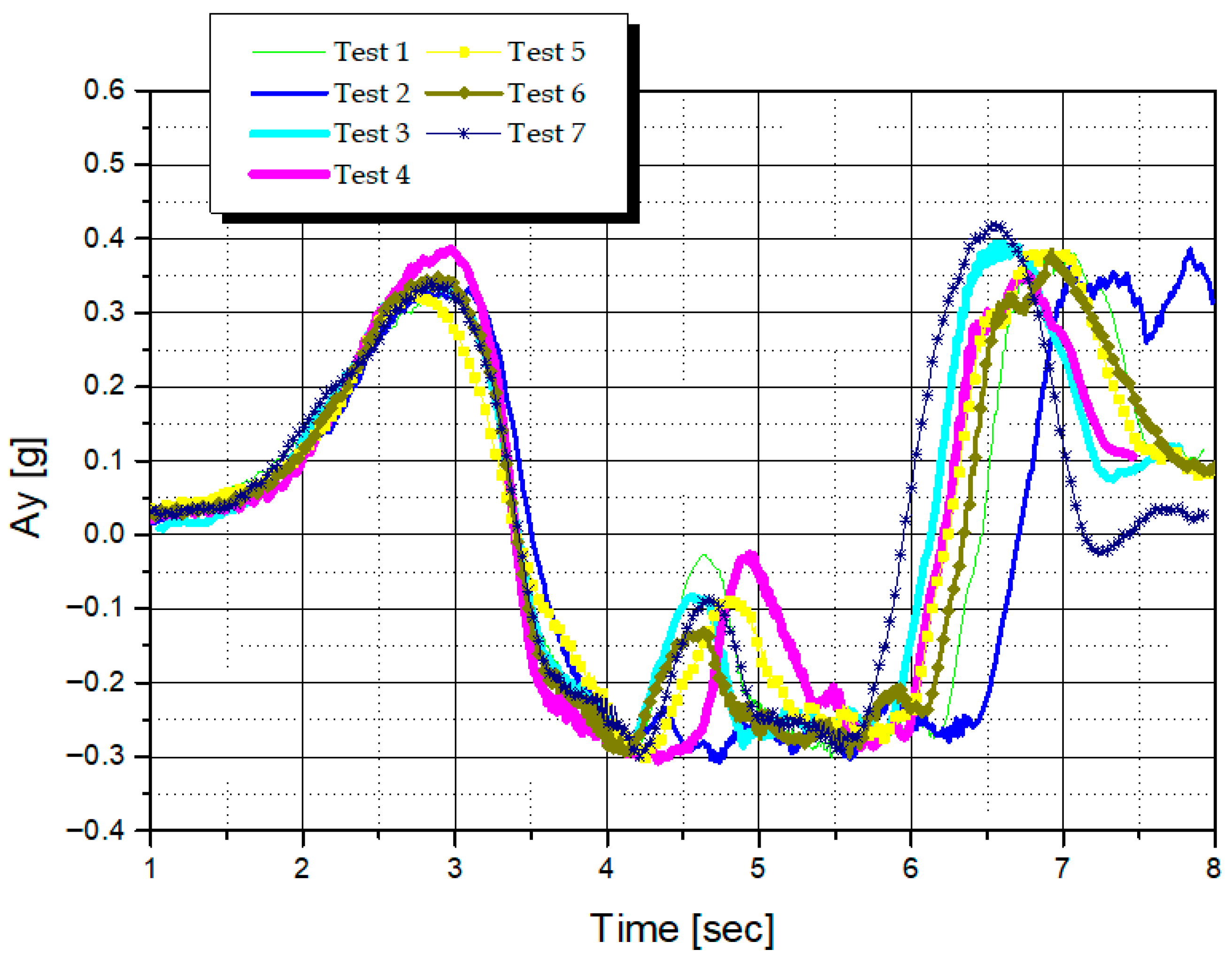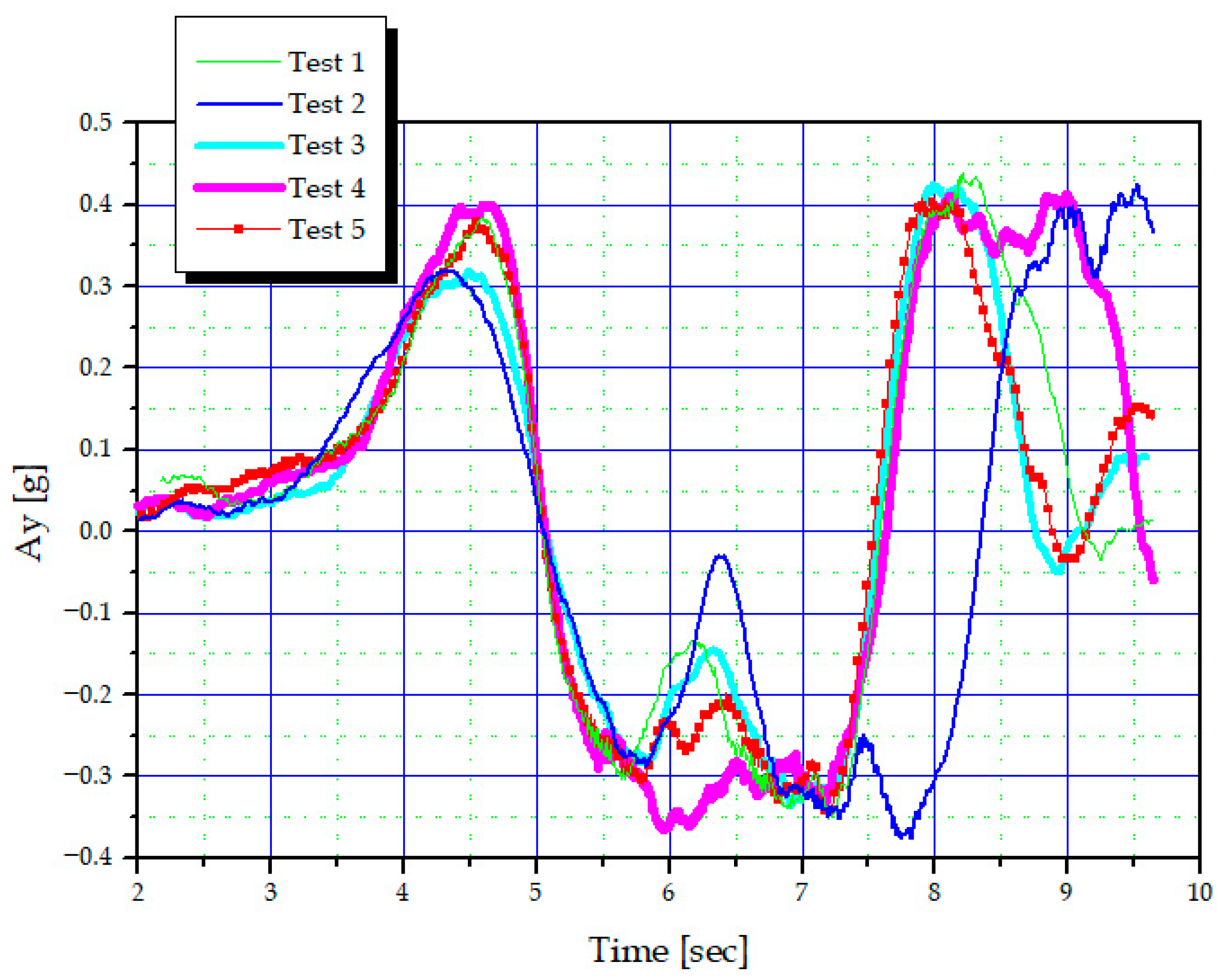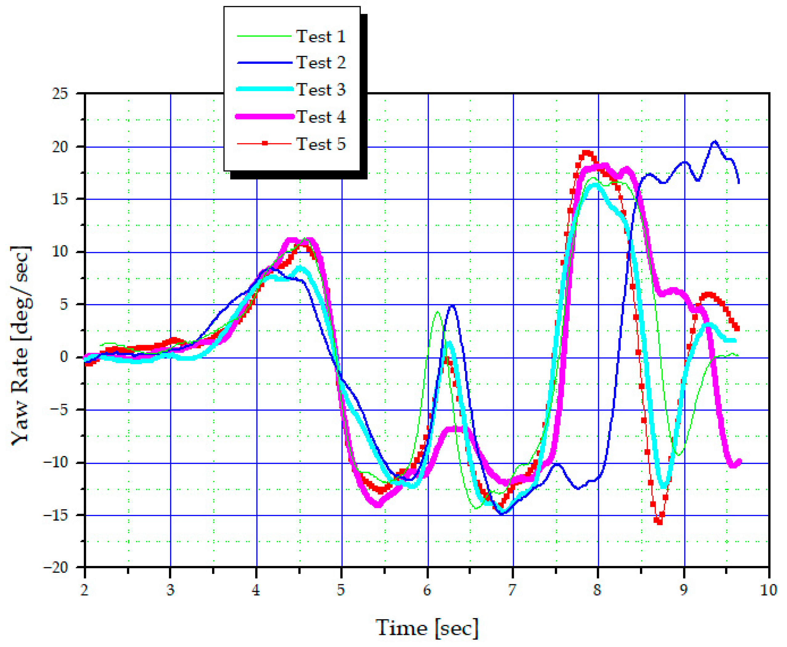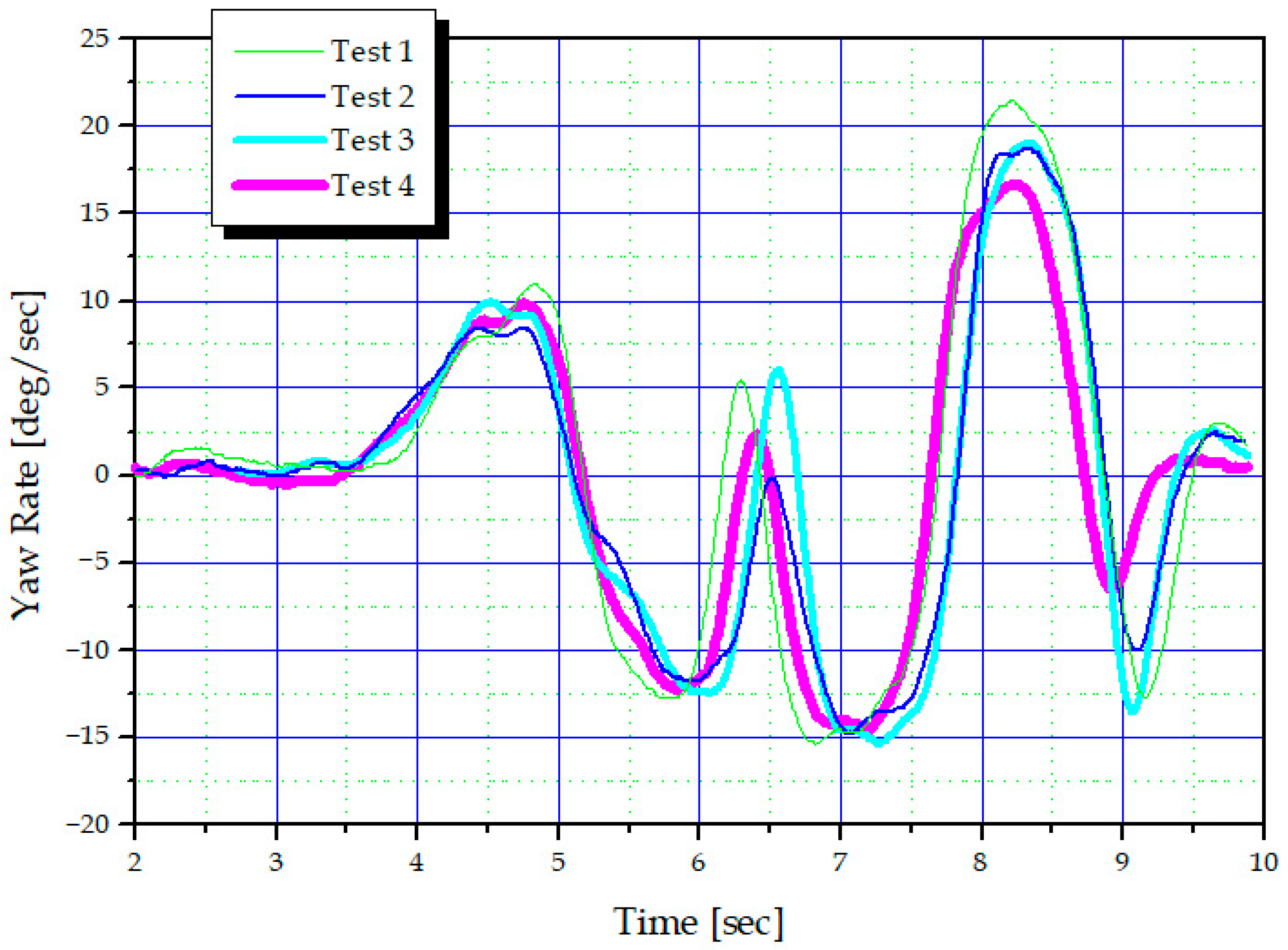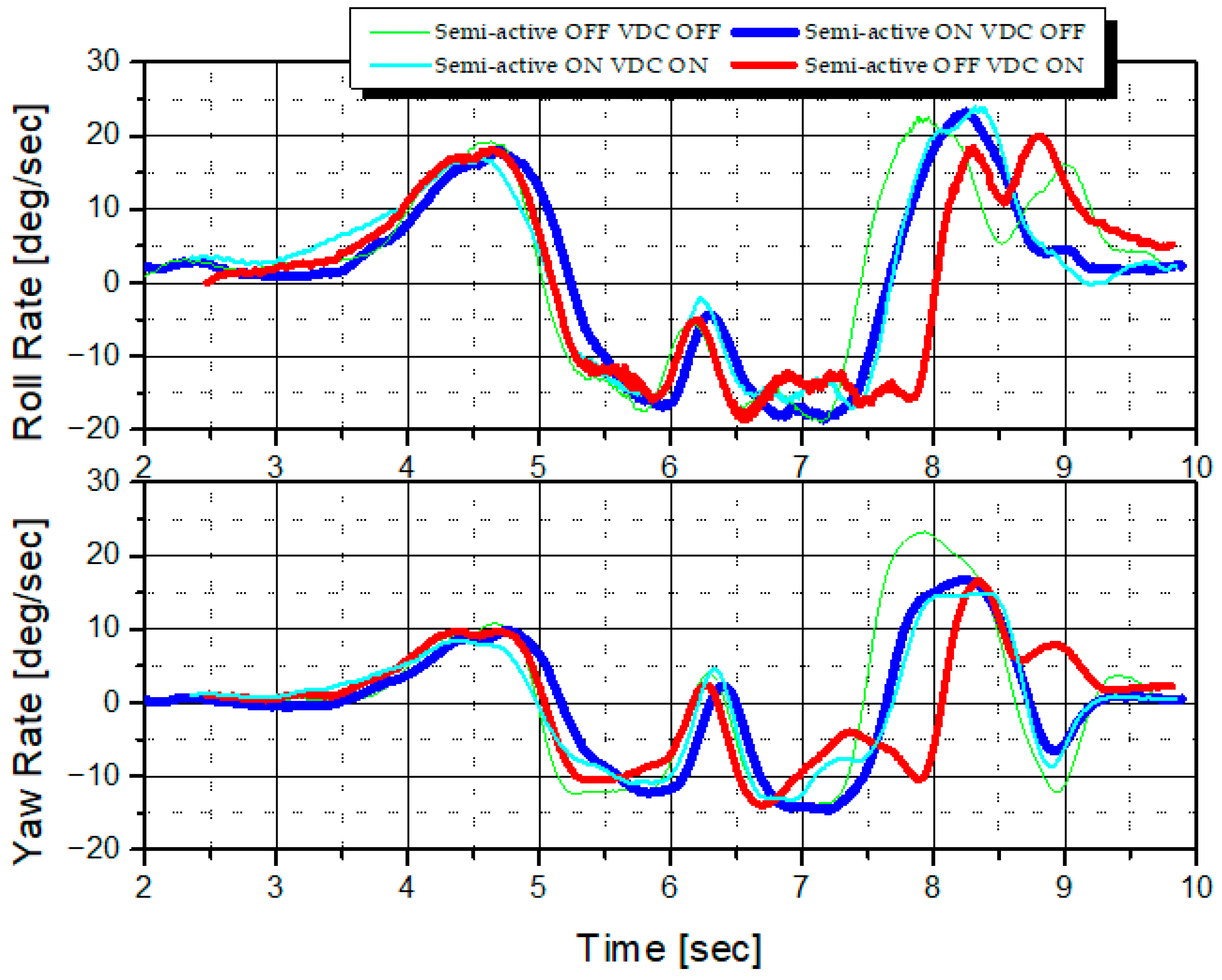 Figure 10, and vehicle responses were measured at a constant speed of 70 km/h. The semi-active handling control tuning results were summarized based on roll rate, yaw rate, and lateral acceleration. To ensure the validity of the measurement results, the measurements were repeated at least three times under identical conditions.