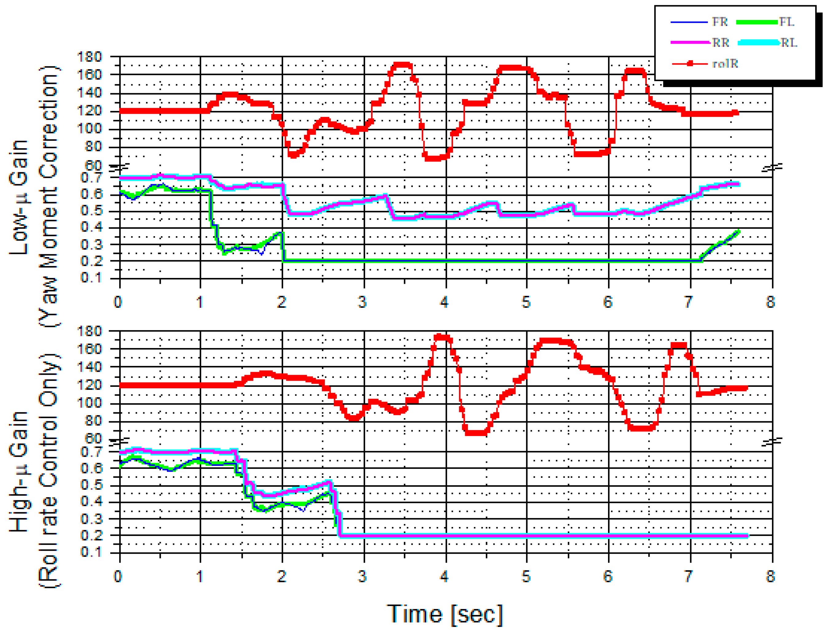 By calculating the lateral acceleration change component of the vehicle using the driver’s input, the roll rate control amount, as described in the previous section, can be weighted to define the compensation yaw moment, thereby configuring the handling controller for the entire vehicle. The control amount is calculated using Equation (22).