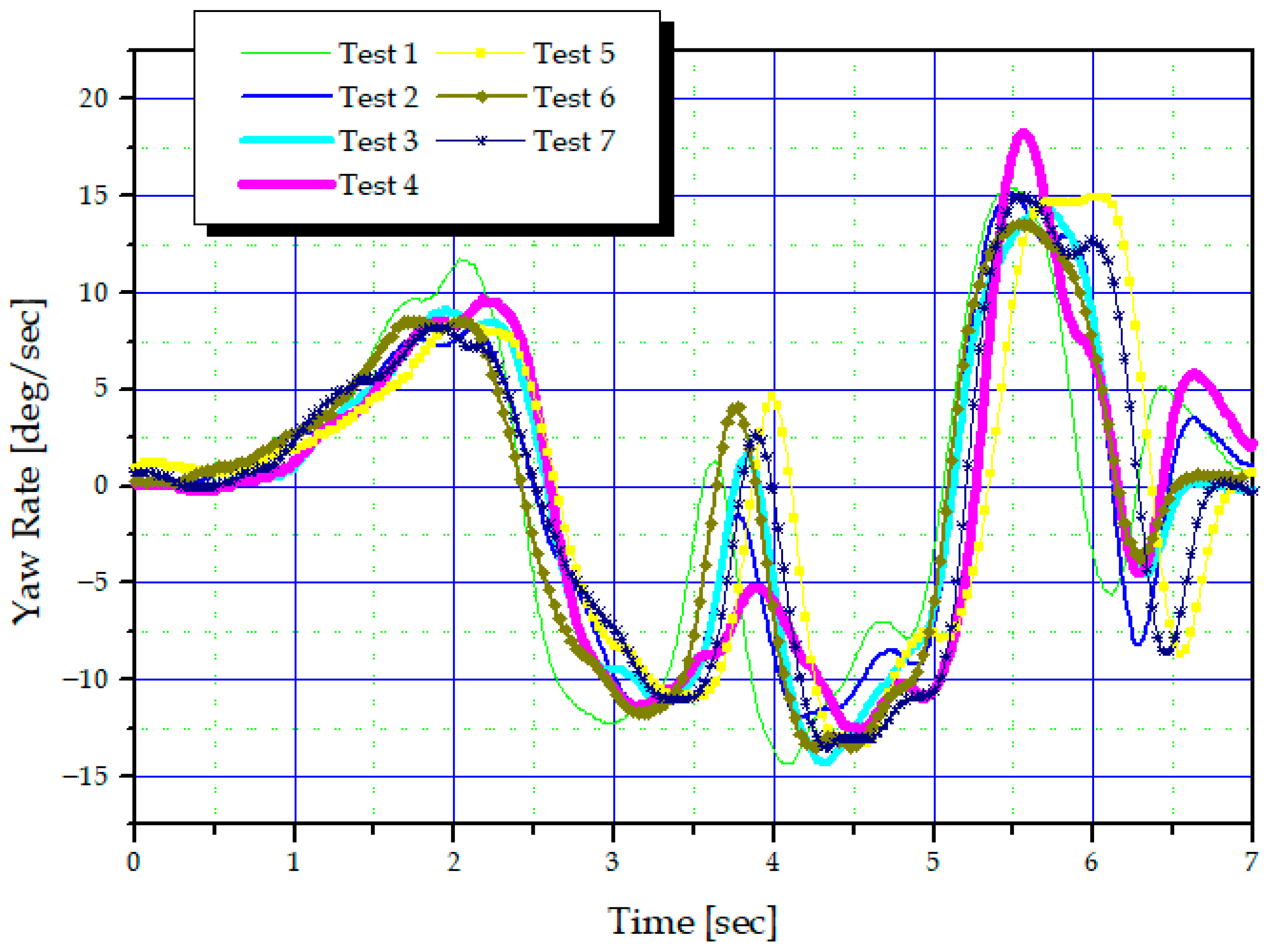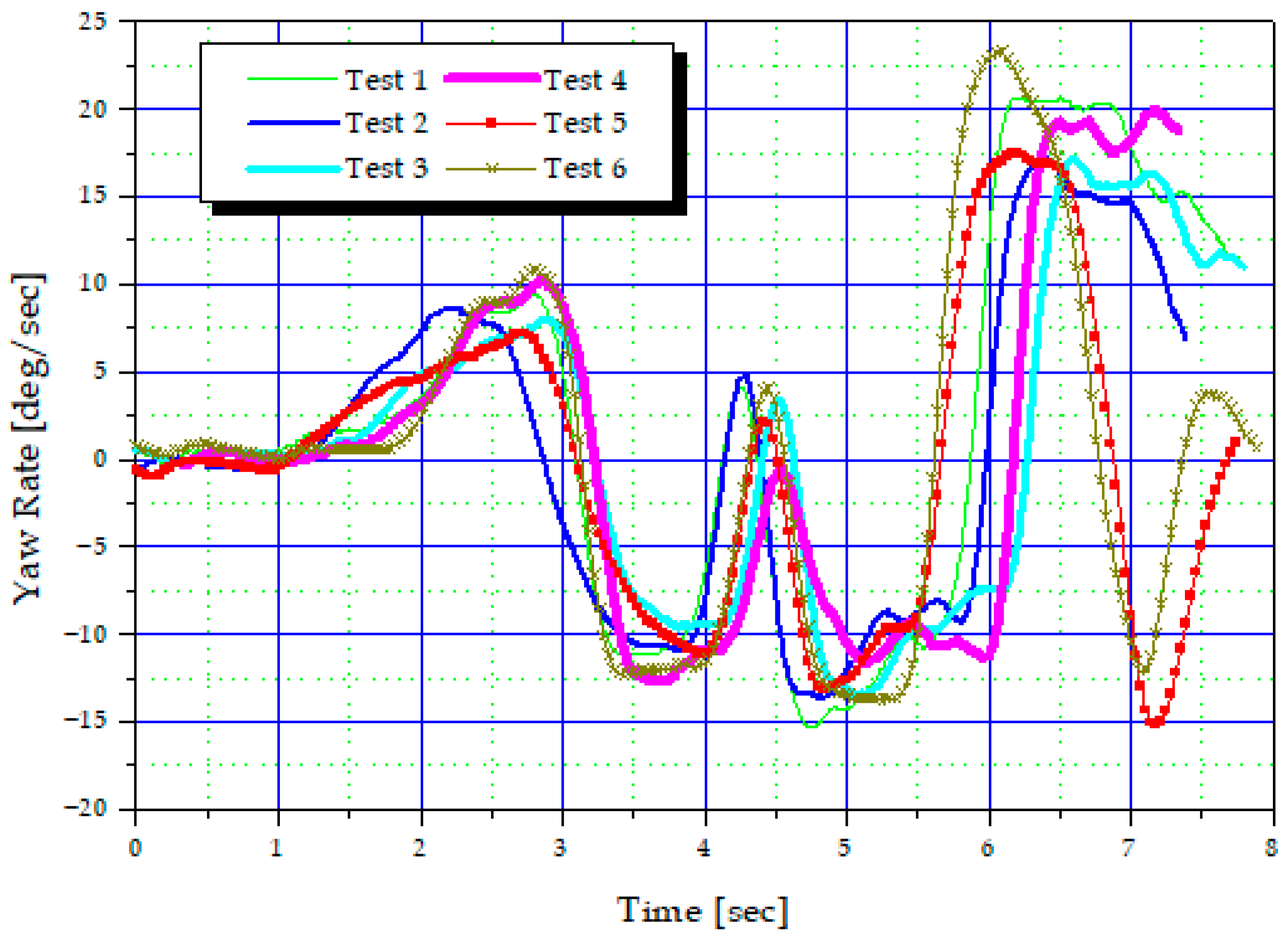 In this vehicle test, a combination of mass-produced VDC sensors (yaw rate, roll rate, and lateral acceleration), a Murata rate gyro, and a Correvit optical velocity sensor was used to precisely measure the vehicle’s yaw, roll, and lateral behavior. All inertial sensors were mounted on a rigid structure near the vehicle’s center of gravity to minimize structural interference. Furthermore, zero-offset calibration was performed before each test session to eliminate temperature and bias variations.
