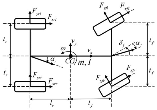 Here, denote the longitudinal velocity, lateral velocity, and yaw rate, respectively. represent the vehicle mass and yaw moment of inertia, respectively. denotes the front steering angle. and represent and , respectively. represent the distances from the vehicle’s center of gravity to the front and rear axles, respectively. denote the half-track widths of the front and rear axles, respectively. represent the longitudinal and lateral tire force vectors, which can be expressed as follows.