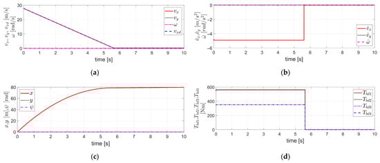 By applying the above conditions, the simulation results for the case where the initial vehicle velocity is 100 km/h (=27.78 m/s) and there is no fault in the brake actuators—i.e., and —are shown in Figure 5.