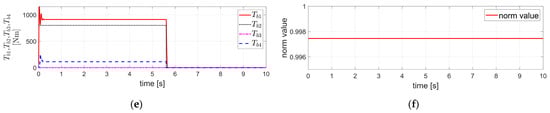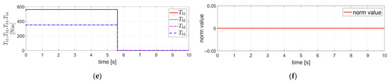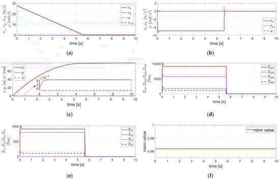 Simulation results obtained by applying the Fault Tolerant Robust Control (FTRC) of four-wheel independent Electro-Mechanical Brake (EMB) actuators using the Time Delay Control (TDC) described in Section 3.1 to the vehicle dynamics in Section 2, under the condition of no EMB actuator fault (i.e., and ): (a) The velocity components ; (b) The acceleration components ; (c) The displacement components , the longitudinal displacement, the lateral displacement, and the yaw angle, respectively; (d) ; (e) ; (f) The value of .