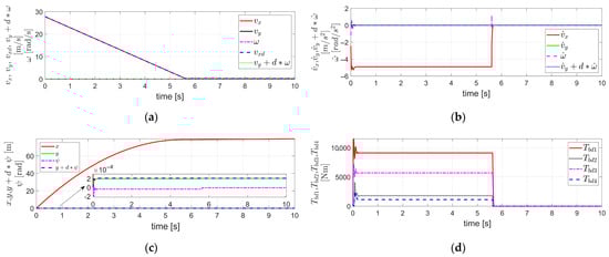 Figure 3 presents the simulation results obtained by applying the same vehicle dynamics and parameters used in the simulation of Figure 2, with the parameters, control gains, and desired values of the TDC in Equation (13) including the in Equation (14) selected identically to those in Figure 2.