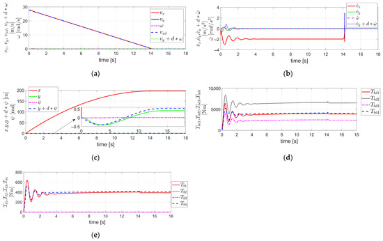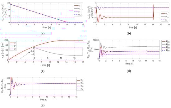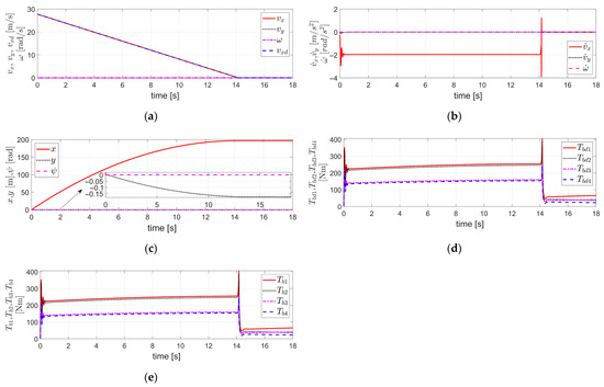 Figure 5a illustrates the velocity components, . As shown in Figure 5a, closely follows , and also tracks well. Furthermore, remains stable and maintains a value close to zero. Figure 5b illustrates the acceleration components, . Although significant overshoot is observed during the initial and final phases of deceleration, closely follows , and also tracks relatively well. Additionally, remains close to zero throughout the simulation. Figure 5c illustrates the longitudinal displacement , lateral displacement , and yaw angle . The variable represents the braking distance, while remains nearly zero. The variable exhibits a stable response, being bounded within a negative maximum value of approximately 0.18 m. Figure 5d shows , and Figure 5e shows . As mentioned above, this corresponds to the case without any fault in the brake actuators; i.e., and . In this case, and have identical values. Figure 5d,e show that both and exhibit significant overshoot behavior at the beginning and end of deceleration. The reason they maintain nonzero steady-state values even after braking has completed is presumed to be due to the continued compensation control for the unmodeled uncertainties and external disturbances of the 14 DOF vehicle dynamics. Unlike Figure 2, Figure 3 and Figure 4, Figure 5 does not present the results corresponding to the stability condition of Equation (15). This is because the mathematical model equations of the Matlab/Simulink VDBS 14 DOF vehicle dynamics used as the control target in this section are not well known. Consequently, when attempting to represent the system in the form of the external dynamics described by Equation (12) or Equation (18), it is difficult to identify the specific mathematical expressions for each term in Equation (12) or Equation (18). Therefore, the matrix in Equation (12) or the matrix in Equation (18) cannot be clearly determined. Therefore, the results related to the stability conditions of Equation (15) could not be presented in Figure 5.