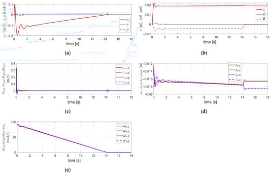 Simulation results obtained under the same conditions as those in Figure 5: (a) The velocity components , the vertical translational velocity, the roll angular velocity, and the pitch angular velocity of the vehicle body, respectively; (b) The displacement components , the vertical displacement, the roll angle, and the pitch angle of the vehicle body, respectively; (c) The vertical velocities of each of the four wheels, ; (d) The vertical displacements of each of the four wheels, ; (e) The rotational angular velocities of each of the four wheels, .
