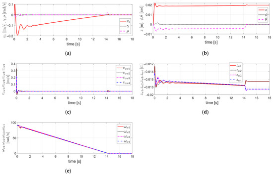 Figure 6a shows the vertical translational velocity of the vehicle body, the roll angular velocity , and the pitch angular velocity , all of which exhibit stable responses. Figure 6b shows the vertical displacement of the vehicle body, the roll angle , and the pitch angle , all of which exhibit stable responses with bounded values. Figure 6c shows the vertical velocities of each of the four wheels, all of which exhibit stable responses. Figure 6d shows the vertical displacements of each of the four wheels, all of which exhibit stable responses and have bounded values. Figure 6e shows the rotational angular velocities of each of the four wheels, all of which exhibit stable responses.