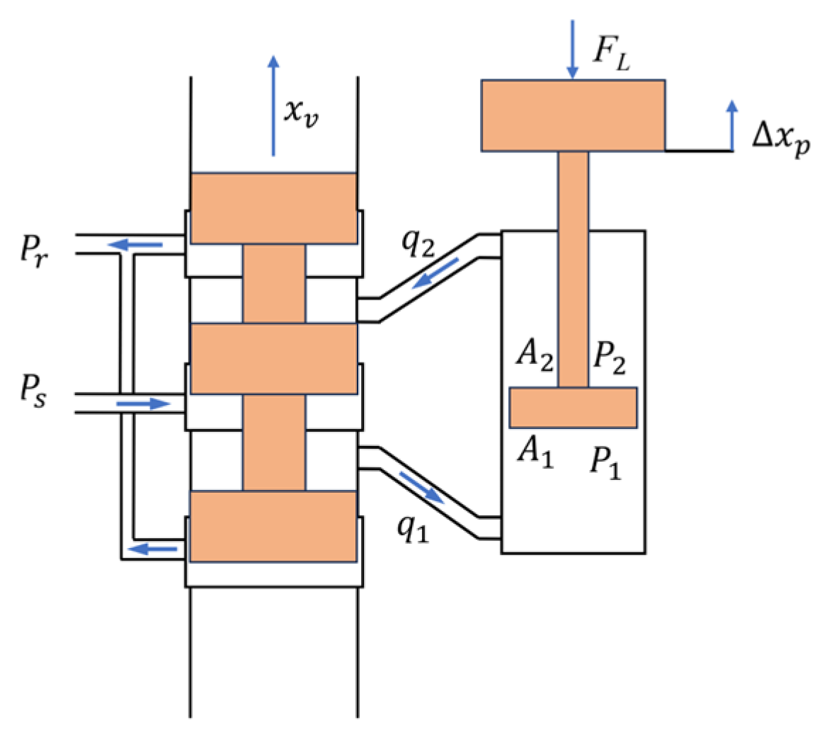 Figure 2. During the working process, the servo valve obtains electrical control signals, causing the spool to generate corresponding displacement and thus guiding hydraulic fluid into the rod chamber and rodless chamber of the hydraulic cylinder, respectively. By adjusting the fluid pressure in both chambers, a required pressure difference is generated, which drives the hydraulic cylinder’s piston rod to produce axial linear displacement. This enables precise piston position control, ultimately achieving actuator output motion.