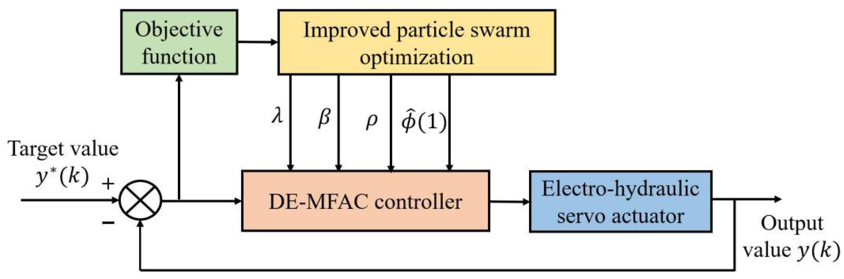 Figure 3 illustrates the parameter optimization mechanism for the DE-MFAC controller in the electro-hydraulic servo actuator adopting the IPSO algorithm. In this configuration, the deviation of the actual output signal from the desired signal serves as the input for the objective function, specifically