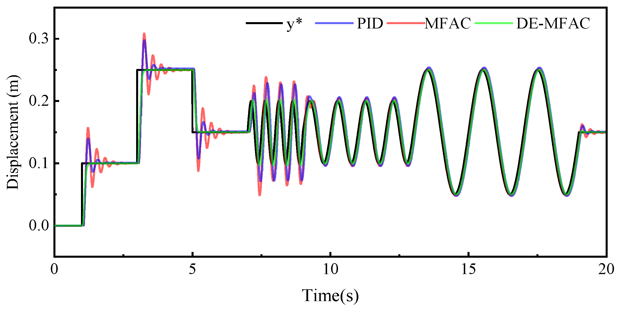Within the defined reference output signal, the time intervals 0–3 s, 3–5 s, and 19–20 s correspond to ascending step signals, while the 5–7 s interval represents a descending step signal. For step signal tracking control, overshoot and settling time serve as standard metrics for evaluating control performance. The simulation results in