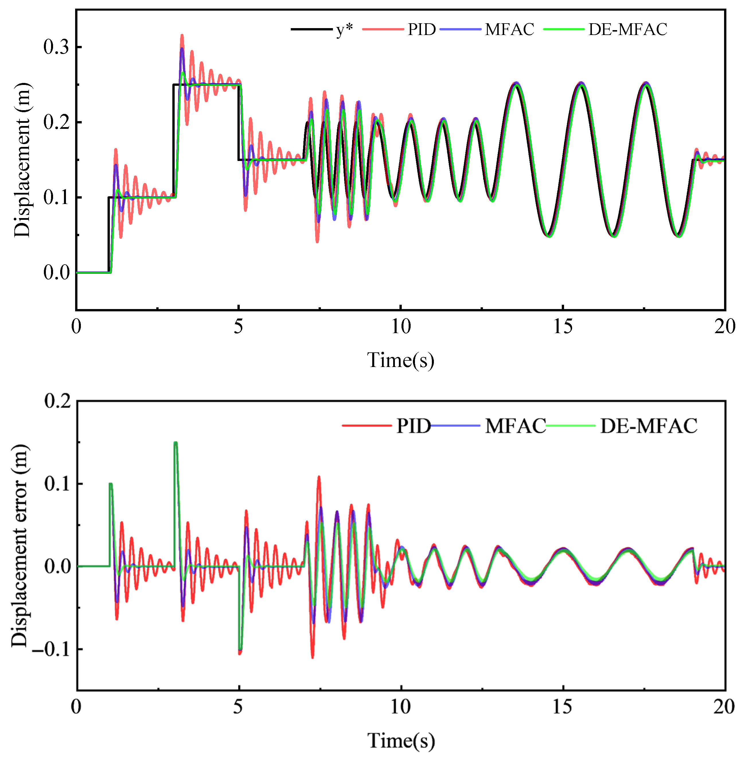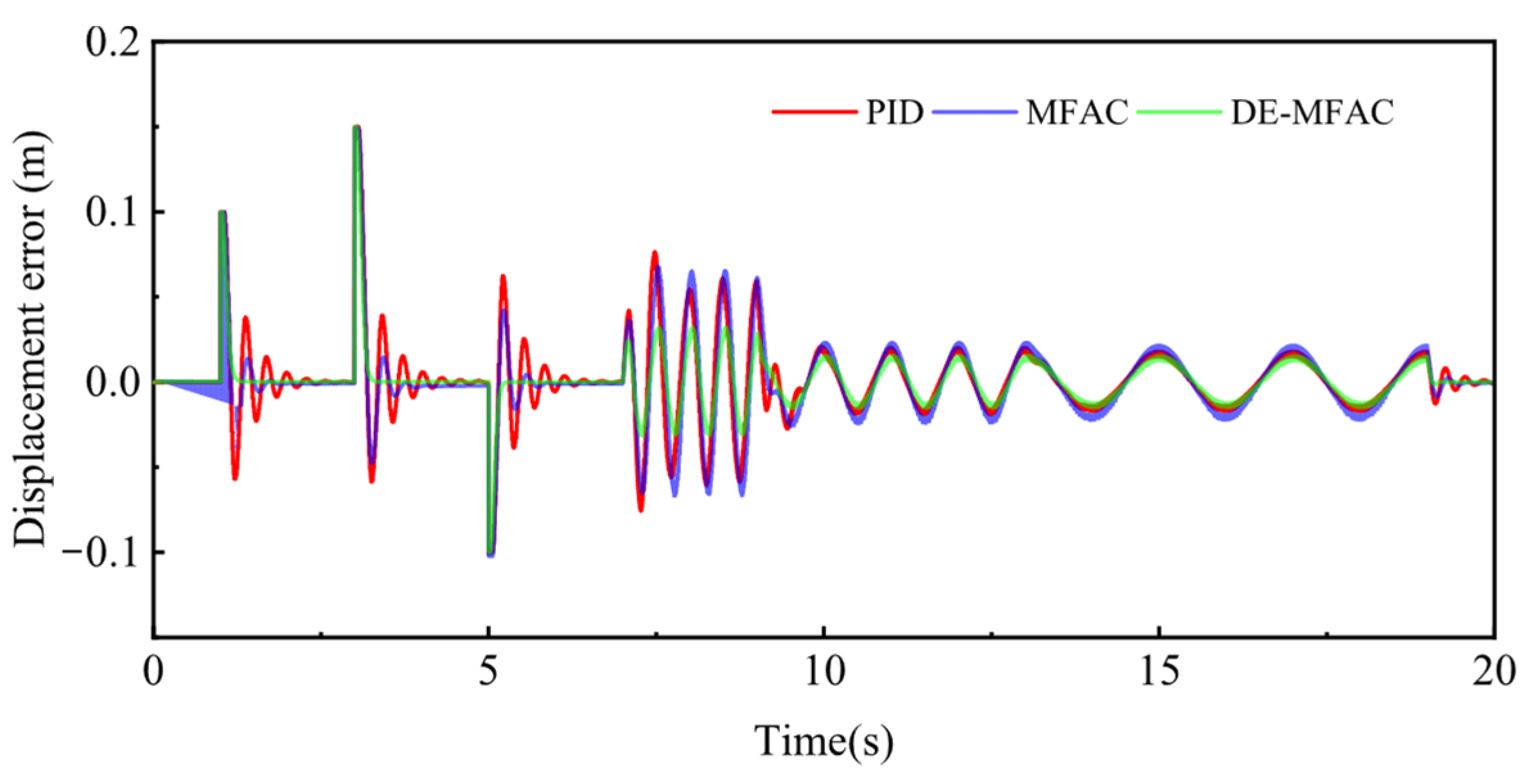 This study adopted PID control, MFAC, and DE-MFAC controllers to conduct simulations of position control for the active suspension electro-hydraulic servo actuator with time delays of 0.05 s and 0.02 s.