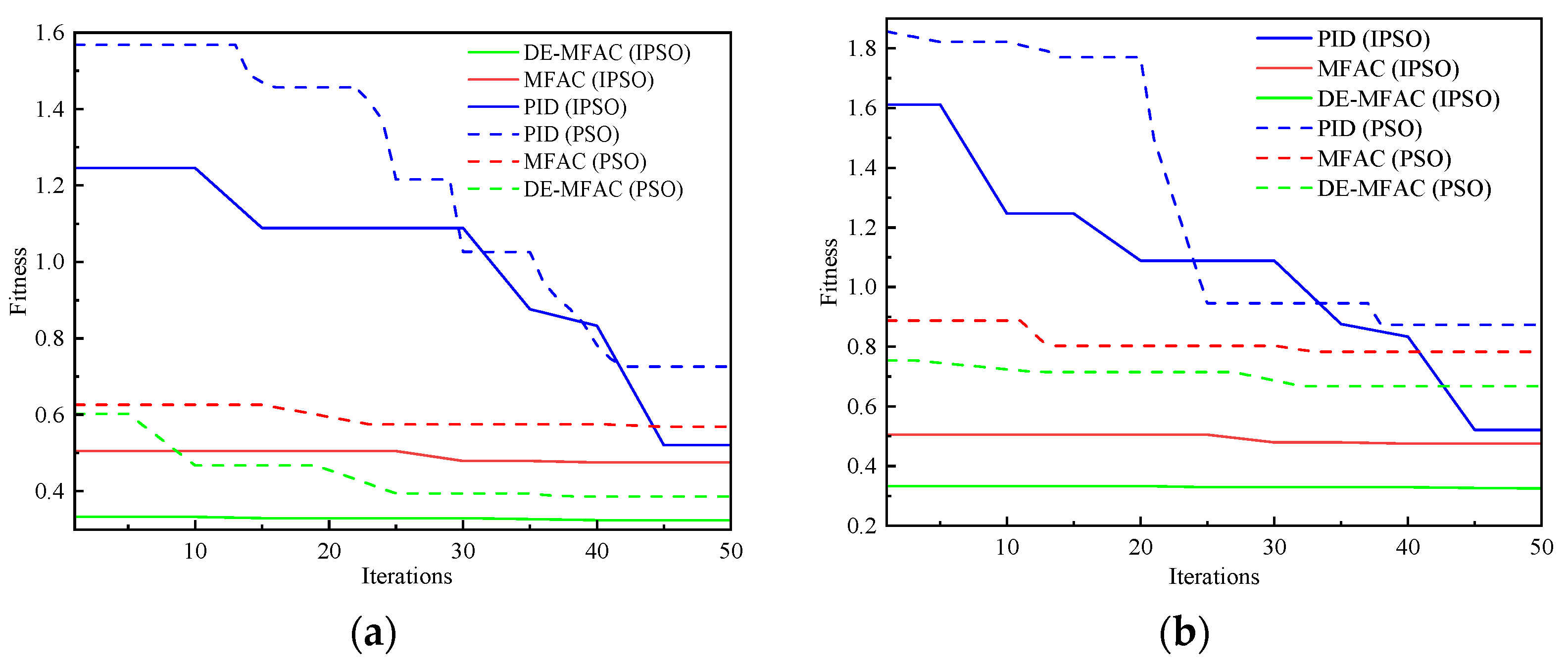 Figure 7a,b illustrate the fitness function values of the particle swarm when the IPSO algorithm is employed to optimize the traditional PID controller, the fundamental MFAC, and the dynamic error-enhanced MFAC under the time delays of 0.02 s and 0.05 s, respectively. The findings indicate that under varying time delays, the DE-MFAC curve reaches a stable state sooner, and its final steady-state fitness value is notably reduced compared to those of MFAC and PID. Moreover, the DE-MFAC response curve displays minimal overshoot, rapid settling, and is virtually oscillation-free. In addition, under the same controller, the final fitness value optimized by IPSO is significantly lower than that of PSO. This indicates that the IPSO algorithm has superior optimization capabilities compared to the PSO algorithm.