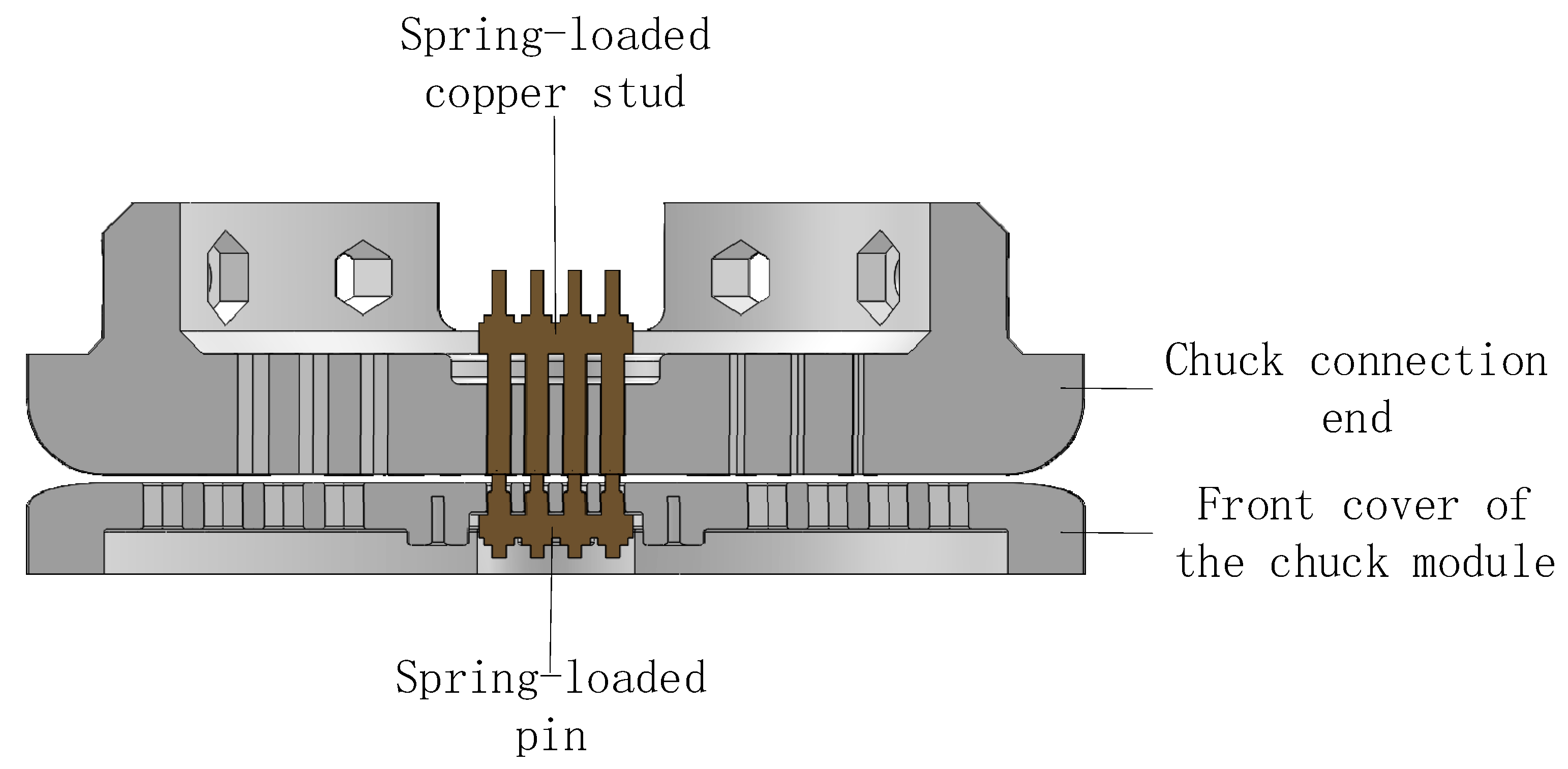 Within the quick-change chuck module, electrical connection between the front cover and chuck connection end is achieved via spring-loaded pins and a spring-loaded copper column module. The interface between the robotic arm end and tool end is centrally located within the chuck module. To enhance system reliability, the electrical connection circuitry employs a redundant design. This structure is simple and efficient, capable of meeting the requirements for current transmission below 10 A and low-speed communication signal transmission. The mechanical structure diagram of the electrical connection module is shown in Figure 3.