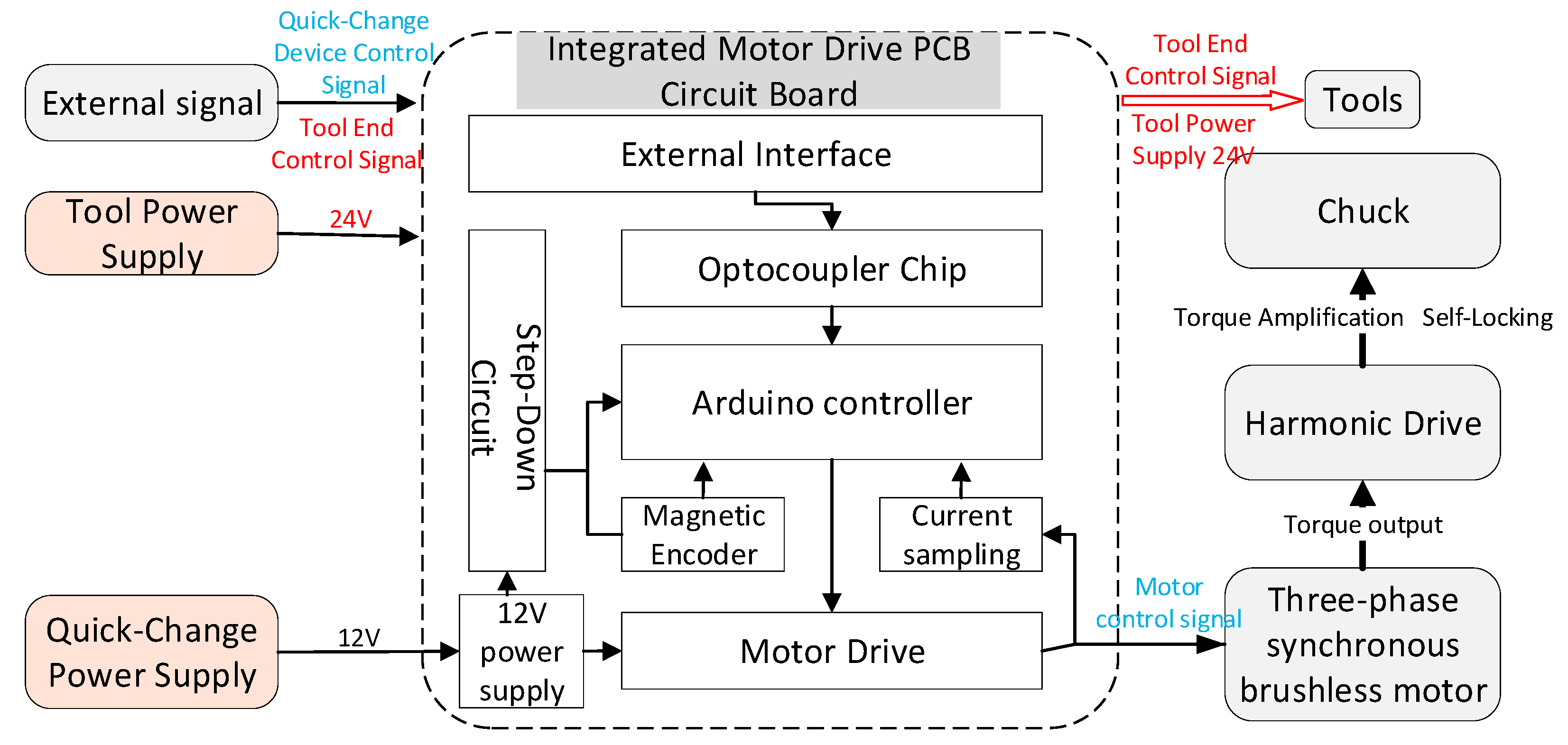 In Figure 4, the tool-end control signals and the 24 V tool power supply do not pass through the internal circuit board of the motor-drive integrated PCB. This is because they are used to control the tool and are connected to the four spring-loaded pins shown in the electrical connection diagram of Figure 3.