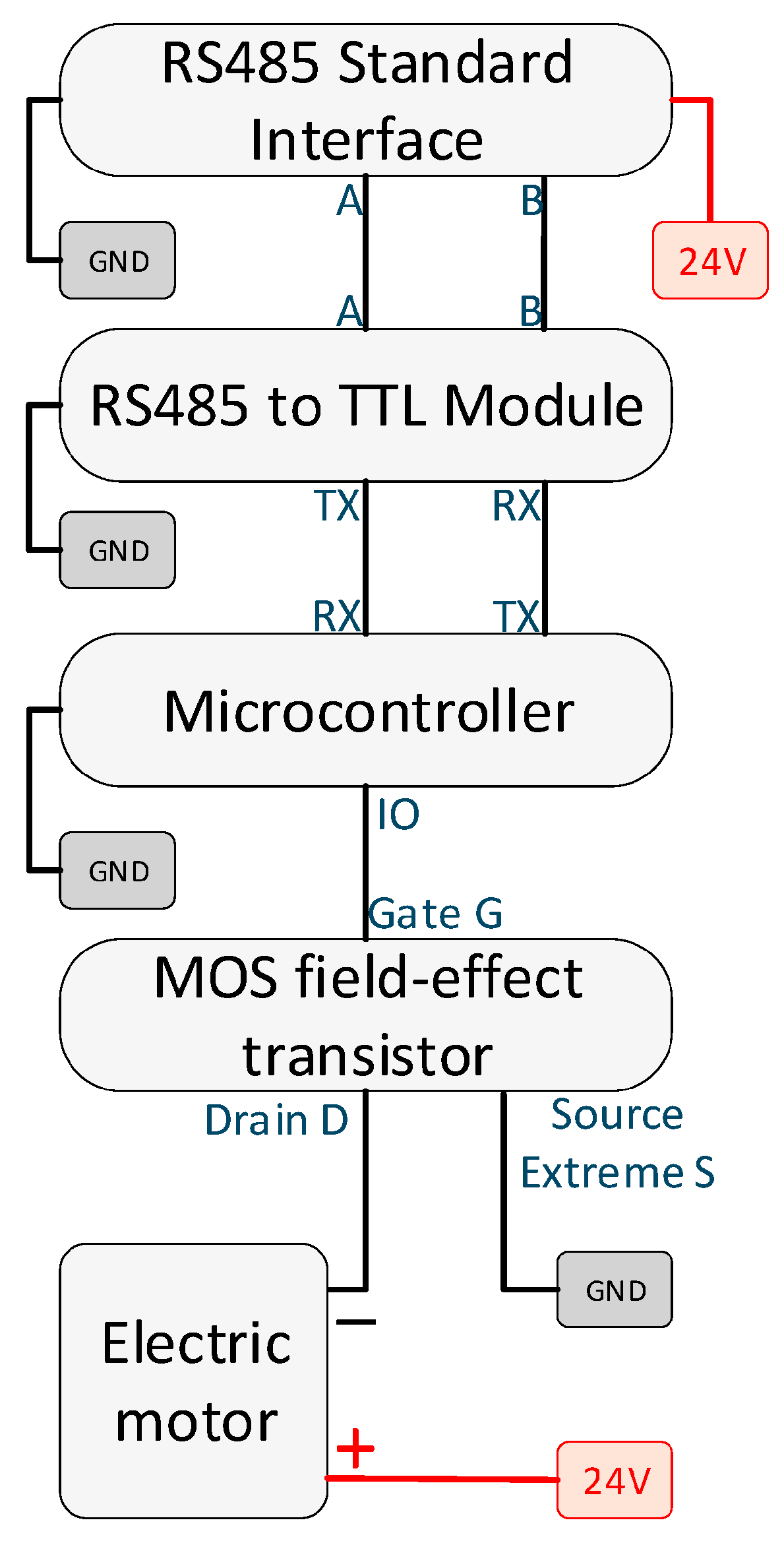 The RS485 standard interface output includes four pins: 24 V positive power supply, GND, A, and B. First, the A and B signals are converted into TTL-level serial signals (TX, RX) via an RS485-to-TTL module for communication with the microcontroller. The microcontroller receives the serial data, parses the communication content, and outputs corresponding IO level signals based on the control commands. This IO signal drives the gate (G) of the MOS field-effect transistor. When the gate is at a high level, the MOS transistor conducts, connecting the drain (D) to the source (S), causing the motor to start rotating. When the gate is at a low level, the MOS transistor turns off, disconnecting the drain from the source, and the motor stops running. The switch drive for the tool-end motor in this paper employs an IRF540NPBF N-channel power MOSFET as the low-side switching device. The drain (D) of the IRF540NPBF is connected in series with the motor circuit, the source (S) is connected to the negative terminal of the system power supply, and the gate (G) is driven by the logic signal output from the controller. By controlling the turn-on and turn-off of the gate-source voltage, the switching control of the motor power supply is achieved. This discrete MOSFET drive solution meets the basic switching requirements of the prototype under rated operating current, enabling verification of the feasibility of the quick-change control process and communication mechanisms. In subsequent designs targeting engineering applications, specialized high-side or low-side driver chips with integrated overcurrent, undervoltage, and reverse connection protection functions can be adopted to enhance system robustness and safety under abnormal operating conditions.