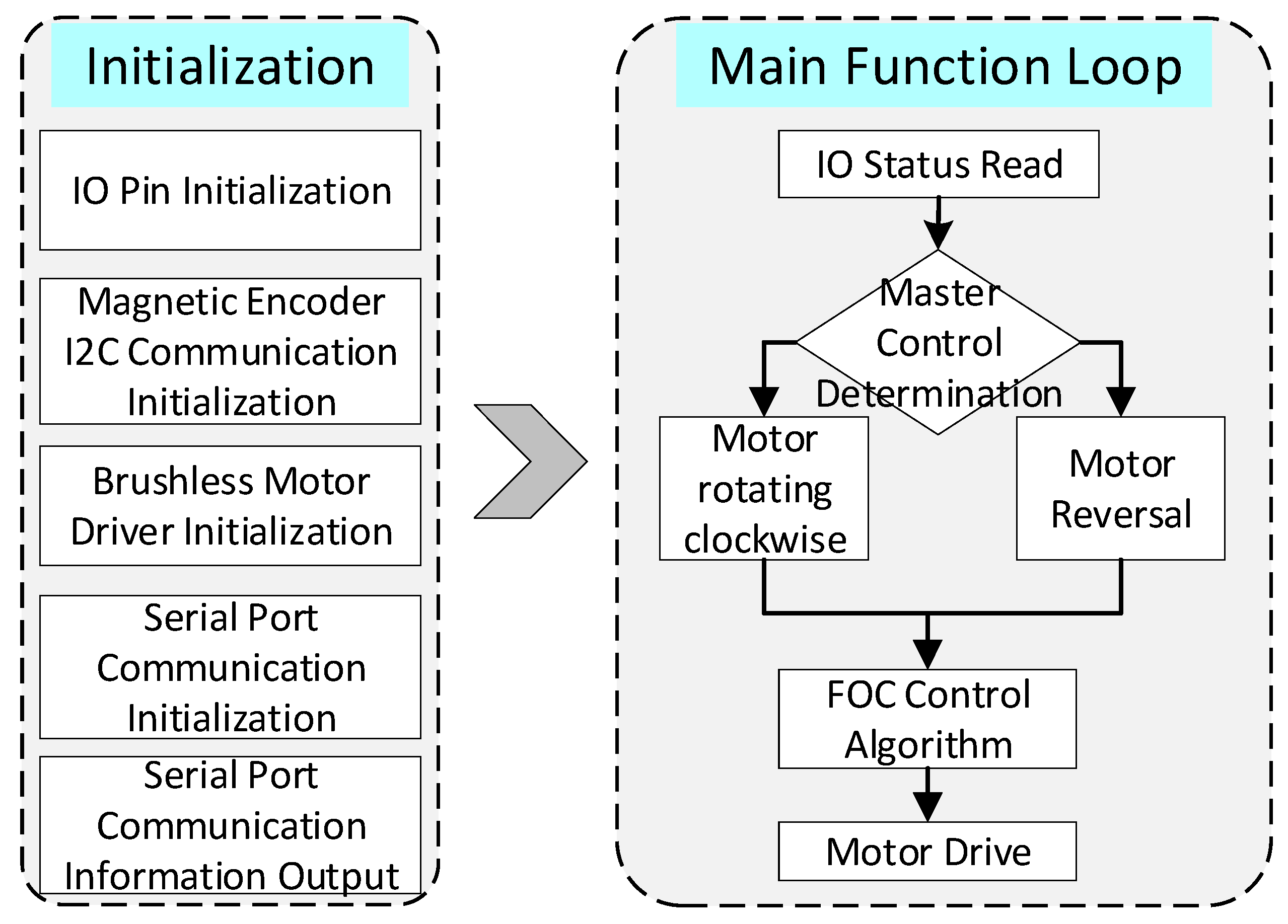 The system program logic begins with peripheral initialization and various setup tasks, then enters the main function’s loop structure. Within this loop, the system continuously monitors IO status changes. Upon detecting a valid level transition, it determines the motor rotation direction based on preset logic and generates corresponding control commands. Ultimately, the motor is driven to execute precise rotational motion through the FOC control algorithm. The overall program flow is illustrated in Figure 6.