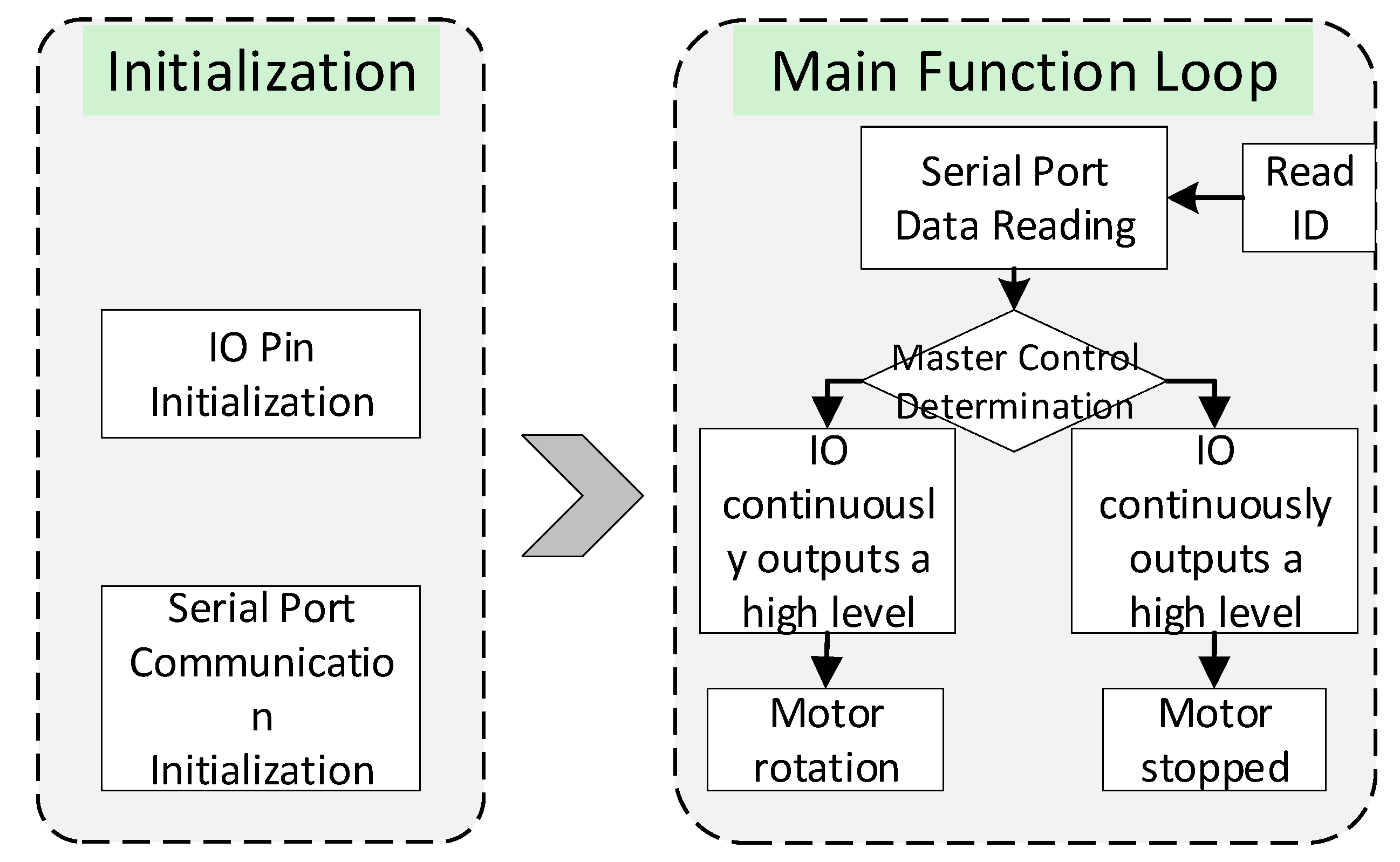 The control program on the tool end adopts a simple polling architecture. After system startup completes the initialization process and reads the ID, it immediately enters the main loop to continuously monitor serial port data. Upon receiving a valid command, the main controller parses the protocol and controls the corresponding GPIO port to continuously output a high or low level, thereby driving the DC motor to rotate or stop. The program logic flow is shown in Figure 7.