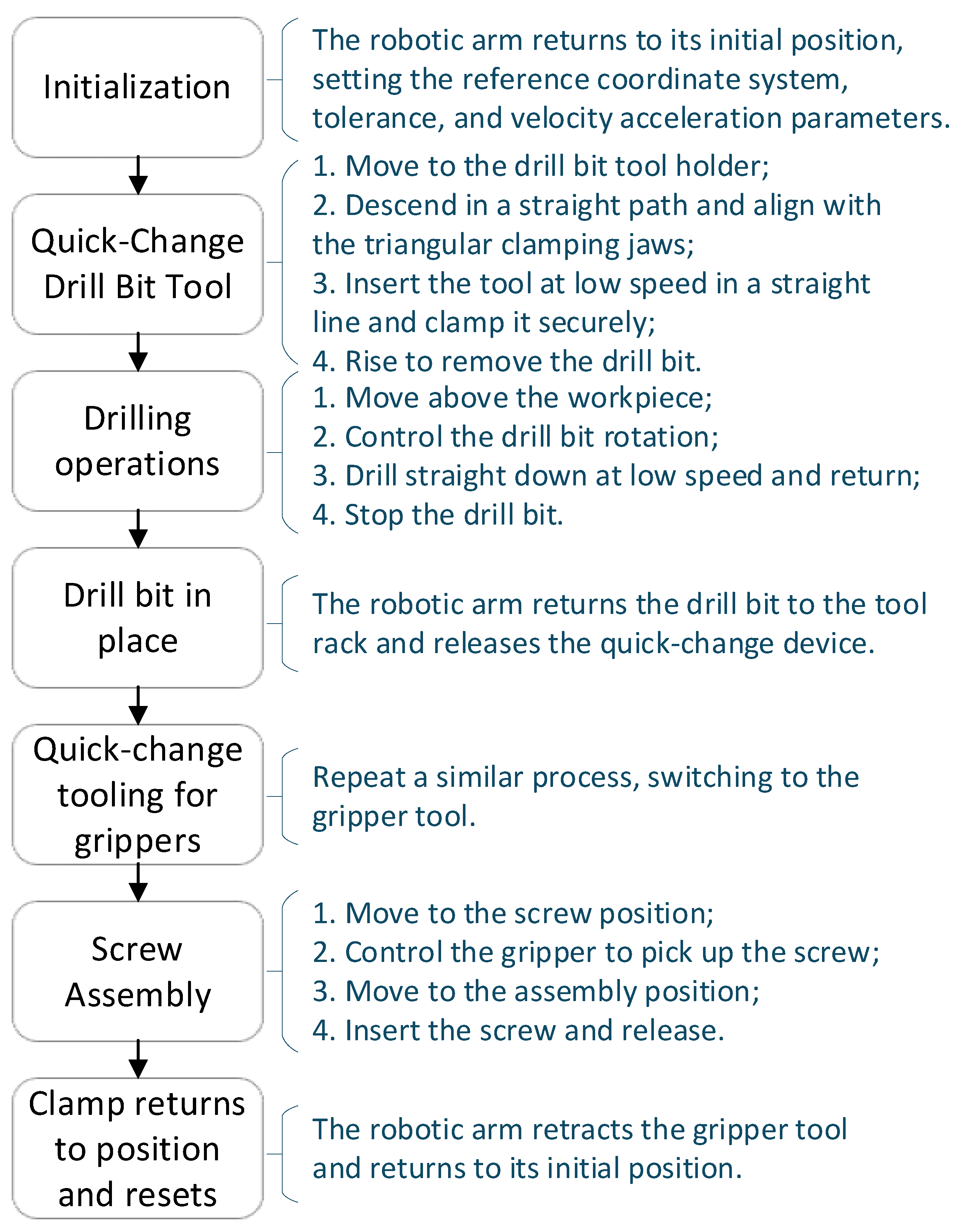 The figure above illustrates the overall workflow of the proposed quick-change control system, whose core characteristics distinguish it from existing methods: it integrates robotic arm movement, a unified RS485-based communication interface, and upper-level computer ROS task scheduling into a single complete chain. This enables quick-change execution, tool motion control, and task workflow coordination to be realized within the same unified framework. Unlike conventional single-tool control workflows, this diagram highlights the coupled relationship among three phases: “multi-tool switching,” “tool status verification,” and “task-level sequential execution.” This forms the unique control architecture of the rapid tool change system proposed herein. The workflow not only describes the rapid tool change action itself but also reflects the system’s state transition logic during multi-step operational tasks, aiding in understanding the execution mechanism of the assembly process in subsequent experiments.