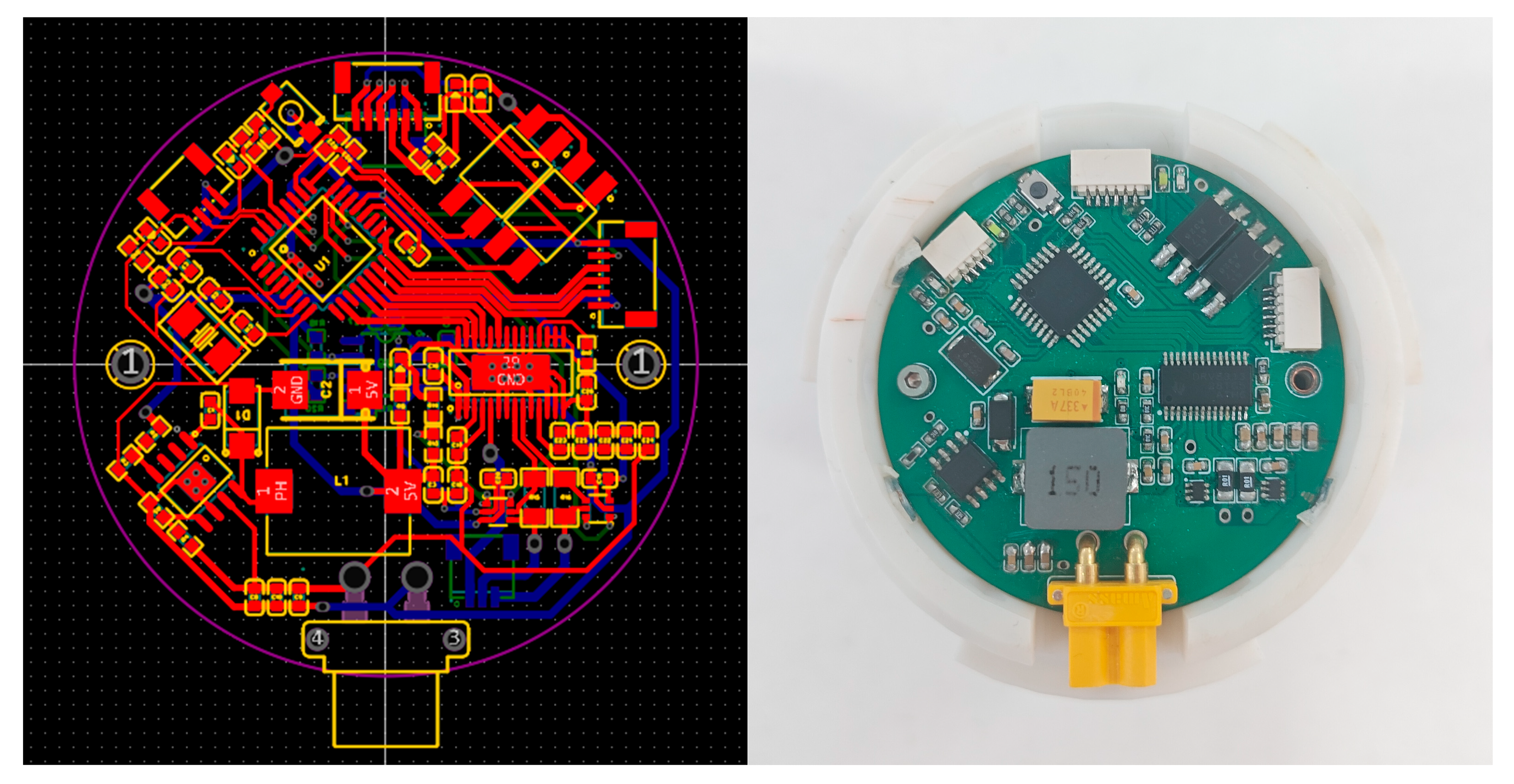 The left diagram shows the PCB schematic design drawn according to control requirements, illustrating the electrical functional relationships and interface layout of the adapter module. The right diagram depicts the actual circuit board manufactured based on this design. The PCB substrate was manufactured by a professional PCB fabrication facility following the circuit layout in the left diagram. Subsequently, I assembled the components using conventional electronic manufacturing techniques, including soldering the TPS5450 voltage regulator chip, DRV8313 motor driver chip, AS5600 magnetic encoder chip, resistors, capacitors, and other components onto their designated pads using tools such as a soldering iron, solder wire, and hot air gun. The image on the right shows the finished adapter board after soldering. It implements tool-end functions such as RS485 communication, power supply regulation, and motor drive. The two images correspond to the circuit design and actual assembly stages, respectively, collectively illustrating the complete construction process of the adapter module.