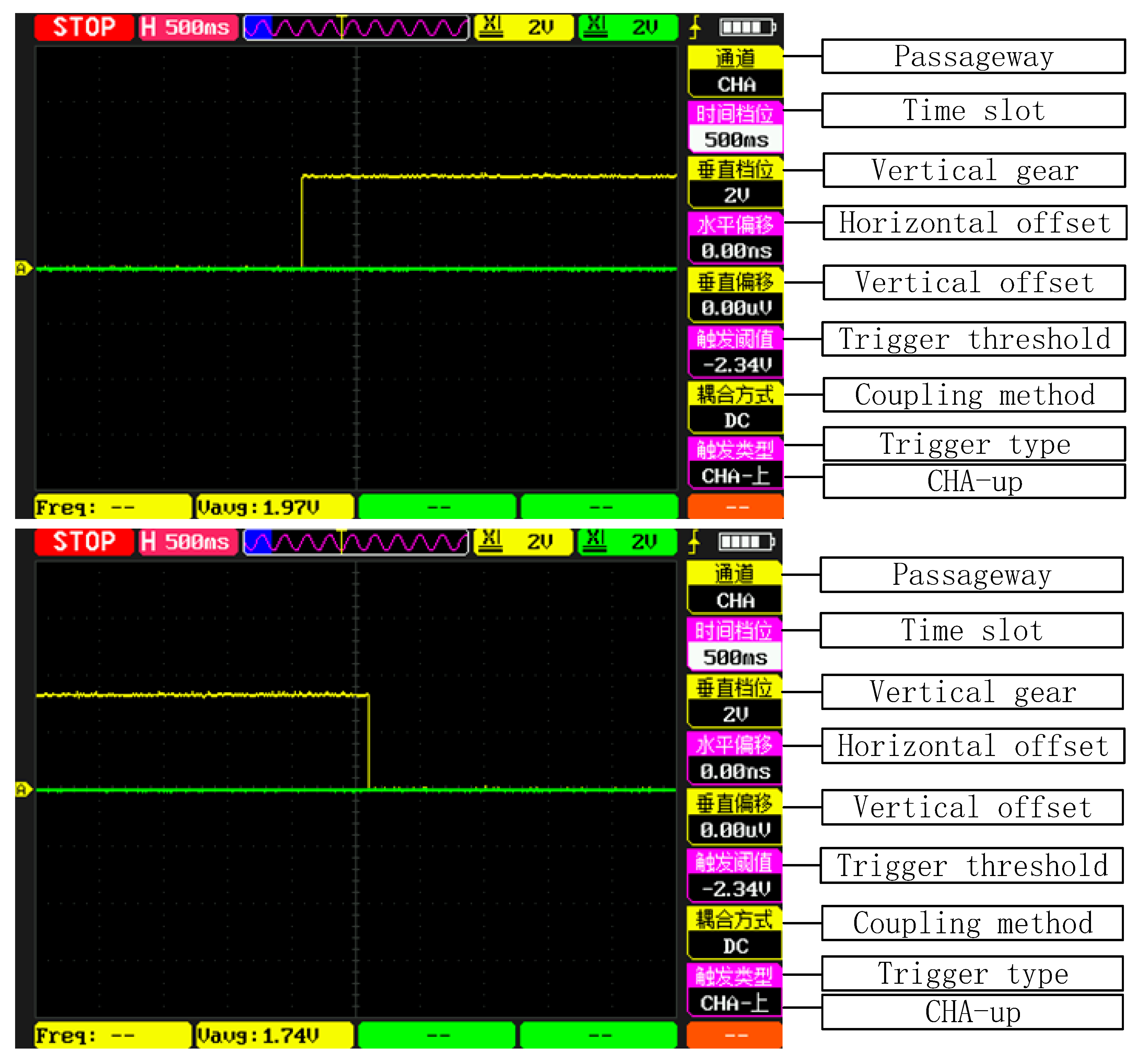 The oscilloscope interface in Figure 11 displays the device’s default Chinese mode. To facilitate understanding of waveform information for readers of different languages, English annotations have been added to the figure. The yellow waveform represents the acquired signal from Channel CH1, while the green waveform represents the acquired signal from Channel CH2. For level acquisition of the I/O port, Channel CH1 is utilized.
